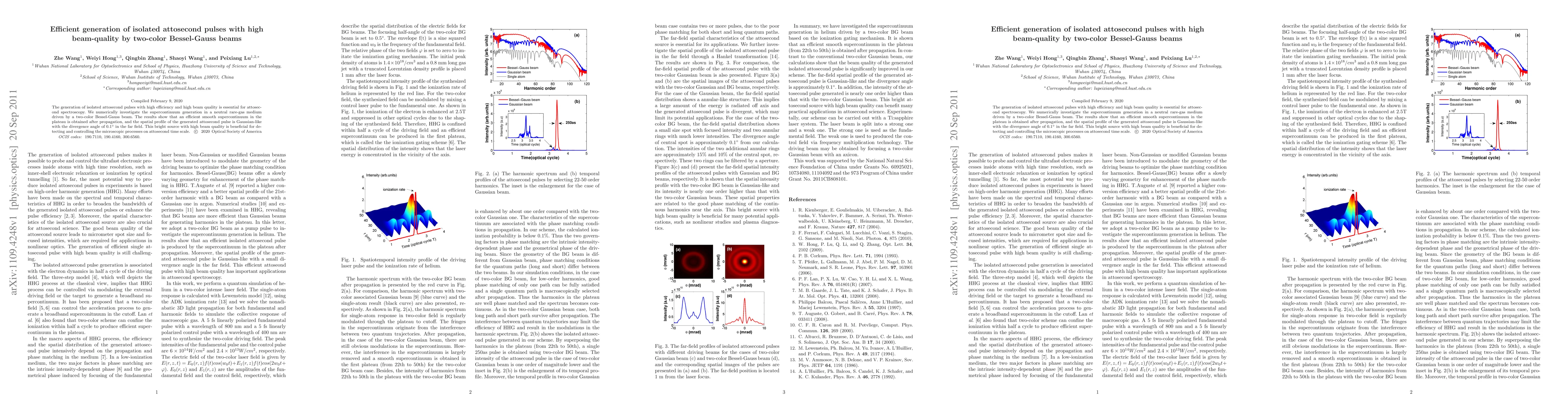 This paper investigates the generation of isolated attosecond pulses using two-color Bessel-Gauss beams, achieving high efficiency and beam quality. The study demonstrates a smooth supercontinuum plateau and a Gaussian-like spatial profile with a divergence angle of 0.1 degree, making it suitable for attosecond spectroscopy.