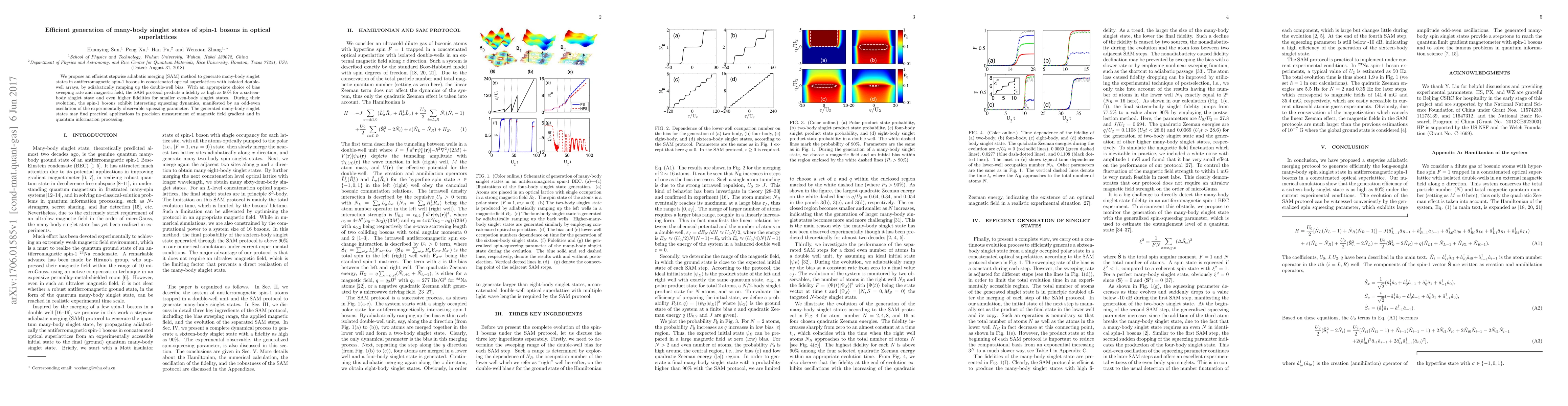 This paper proposes a stepwise adiabatic merging (SAM) method to efficiently generate many-body singlet states of spin-1 bosons in optical superlattices, achieving high fidelity up to 90% for a sixteen-body state. The method involves adiabatically increasing double-well bias, leading to interesting squeezing dynamics and potential applications in magnetic field gradient measurement and quantum information processing.
