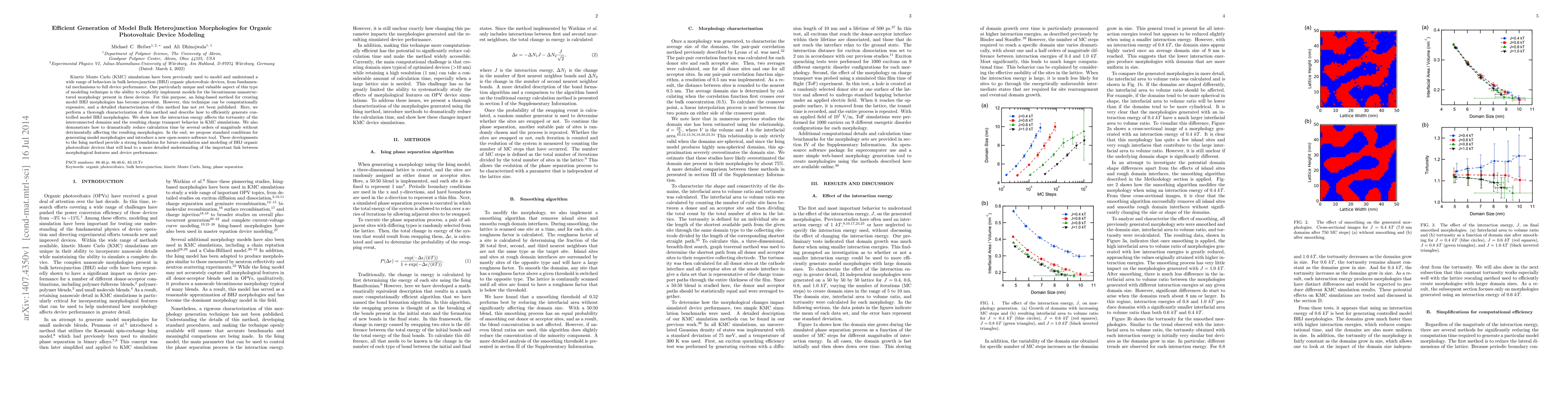 Kinetic Monte Carlo (KMC) simulations have been previously used to model and understand a wide range of behaviors in bulk heterojunction (BHJ) organic photovoltaic devices, from fundamental mechanisms to full device performance. One particularly unique and valuable aspect of this type of modeling technique is the ability to explicitly implement models for the bicontinuous nanostructured morphology present in these devices. For this purpose, an Ising-based method for creating model BHJ morphologies has become prevalent. However, this technique can be computationally expensive, and a detailed characterization of this method has not yet been published. Here, we perform a thorough characterization of this method and describe how to efficiently generate controlled model BHJ morphologies. We show how the interaction energy affects the tortuosity of the interconnected domains and the resulting charge transport behavior in KMC simulations. We also demonstrate how to dramatically reduce calculation time by several orders of magnitude without detrimentally affecting the resulting morphologies. In the end, we propose standard conditions for generating model morphologies and introduce a new open-source software tool. These developments to the Ising method provide a strong foundation for future simulation and modeling of BHJ organic photovoltaic devices that will lead to a more detailed understanding of the important link between morphological features and device performance.