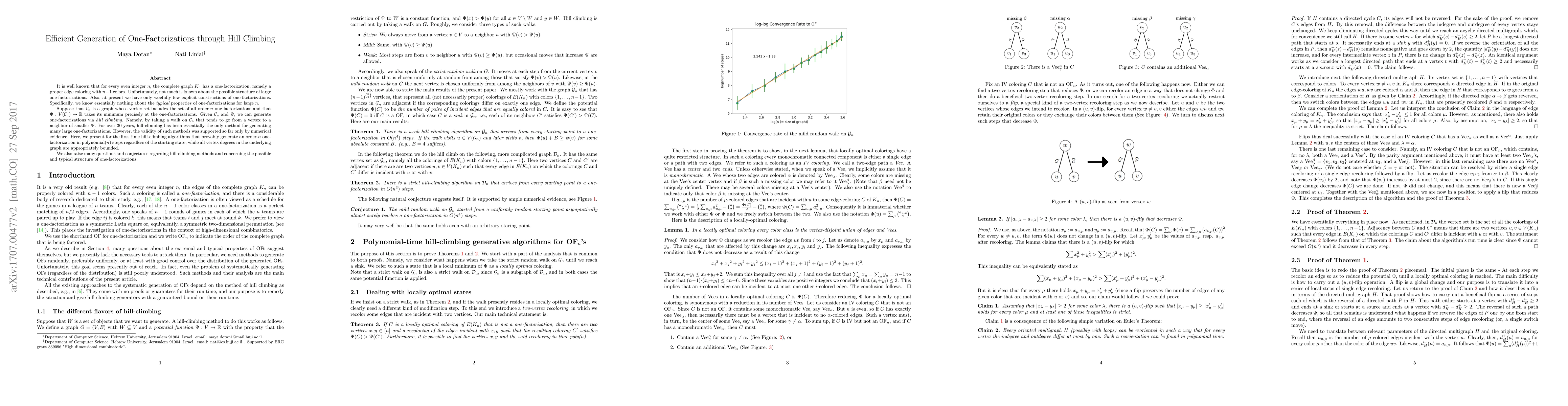 It is well known that for every even integer $n$, the complete graph $K_{n}$ has a one-factorization, namely a proper edge coloring with $n-1$ colors. Unfortunately, not much is known about the possible structure of large one-factorizations. Also, at present we have only woefully few explicit constructions of one-factorizations. Specifically, we know essentially nothing about the {\em typical} properties of one-factorizations for large $n$. Suppose that $\cal C_{\rm n}$ is a graph whose vertex set includes the set of all order-$n$ one-factorizations and that $\Psi: V(\cal C_{\rm n})\to \mathbb R$ takes its minimum precisely at the one-factorizations. Given $\cal C_{\rm n}$ and $\Psi$, we can generate one-factorizations via hill climbing. Namely, by taking a walk on $\cal C_{\rm n}$ that tends to go from a vertex to a neighbor of smaller $\Psi$. For over 30 years, hill-climbing has been essentially the only method for generating many large one-factorizations. However, the validity of such methods was supported so far only by numerical evidence. Here, we present for the first time hill-climbing algorithms that provably generate an order-$n$ one-factorization in $\text{polynomial}(n)$ steps regardless of the starting state, while all vertex degrees in the underlying graph are appropriately bounded. We also raise many questions and conjectures regarding hill-climbing methods and concerning the possible and typical structure of one-factorizations.