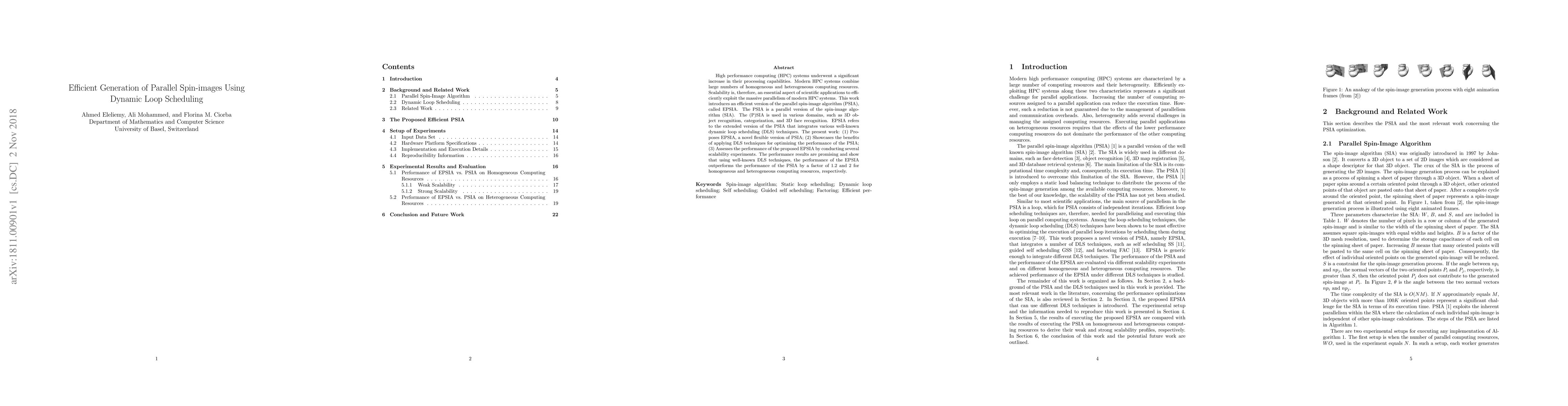 High performance computing (HPC) systems underwent a significant increase in their processing capabilities. Modern HPC systems combine large numbers of homogeneous and heterogeneous computing resources. Scalability is, therefore, an essential aspect of scientific applications to efficiently exploit the massive parallelism of modern HPC systems. This work introduces an efficient version of the parallel spin-image algorithm (PSIA), called EPSIA. The PSIA is a parallel version of the spin-image algorithm (SIA). The (P)SIA is used in various domains, such as 3D object recognition, categorization, and 3D face recognition. EPSIA refers to the extended version of the PSIA that integrates various well-known dynamic loop scheduling (DLS) techniques. The present work: (1) Proposes EPSIA, a novel flexible version of PSIA; (2) Showcases the benefits of applying DLS techniques for optimizing the performance of the PSIA; (3) Assesses the performance of the proposed EPSIA by conducting several scalability experiments. The performance results are promising and show that using well-known DLS techniques, the performance of the EPSIA outperforms the performance of the PSIA by a factor of 1.2 and 2 for homogeneous and heterogeneous computing resources, respectively.