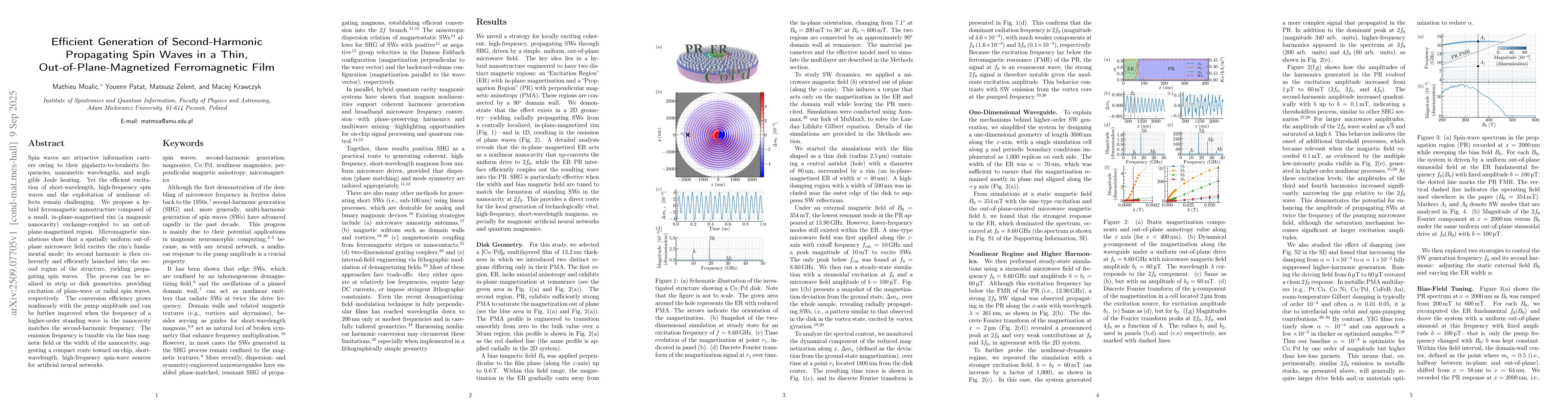 Spin waves are attractive information carriers owing to their gigahertz-to-terahertz frequencies, nanometric wavelengths, and negligible Joule heating. Yet the efficient excitation of short-wavelength, high-frequency spin waves and the exploitation of nonlinear effects remain challenging. We propose a hybrid ferromagnetic nanostructure composed of a small, in-plane-magnetized rim (a magnonic nanocavity) exchange-coupled to an out-of-plane-magnetized region. Micromagnetic simulations show that a spatially uniform out-of-plane microwave field excites the rim's fundamental mode; its second harmonic is then coherently and efficiently launched into the second region of the structure, yielding propagating spin waves. The process can be realized in strip or disk geometries, providing excitation of plane-wave or radial spin waves, respectively. The conversion efficiency grows nonlinearly with the pump amplitude and can be further improved when the frequency of a higher-order standing wave in the nanocavity matches the second-harmonic frequency. The emission frequency is tunable via the bias magnetic field or the width of the nanocavity, suggesting a compact route toward on-chip, short-wavelength, high-frequency spin-wave sources for artificial neural networks.