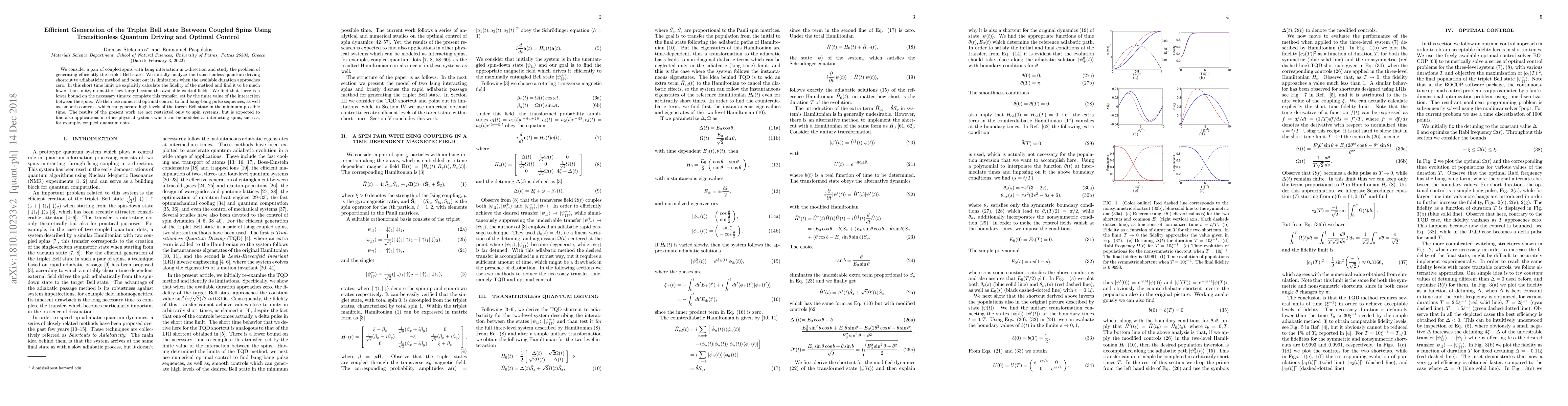 We consider a pair of coupled spins with Ising interaction in z-direction and study the problem of generating efficiently the triplet Bell state. We initially analyze the transitionless quantum driving shortcut to adiabaticity method and point out its limitations when the available duration approaches zero. In this short time limit we explicitly calculate the fidelity of the method and find it to be much lower than unity, no matter how large become the available control fields. We find that there is a lower bound on the necessary time to complete this transfer, set by the finite value of the interaction between the spins. We then use numerical optimal control to find bang-bang pulse sequences, as well as, smooth controls, which can generate high levels of the target Bell state in the minimum possible time. The results of the present work are not restricted only to spin systems, but is expected to find also applications in other physical systems which can be modeled as interacting spins, such as, for example, coupled quantum dots.