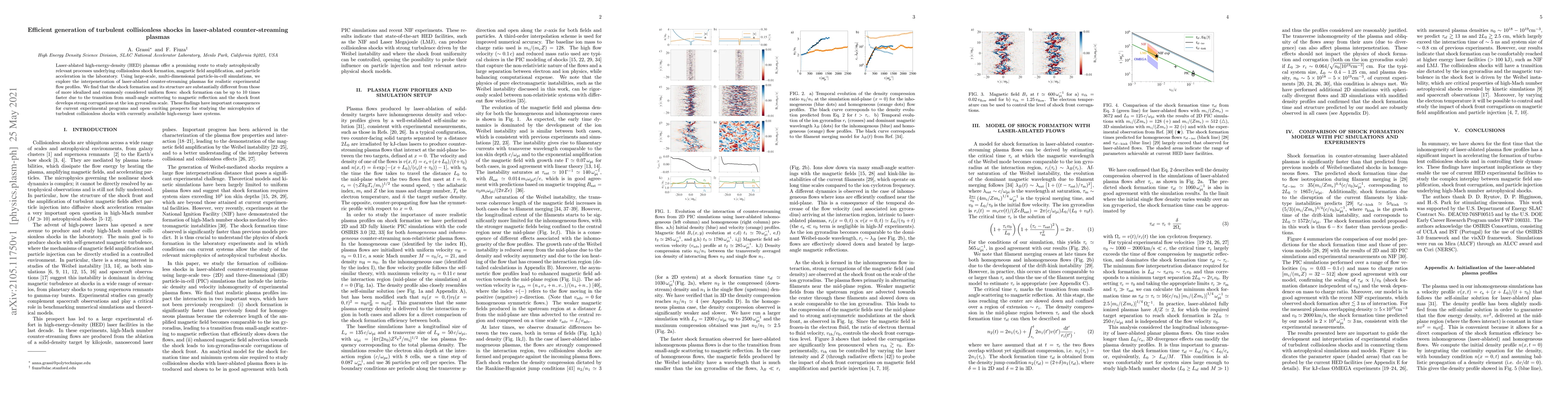 This paper investigates the generation of turbulent collisionless shocks in laser-ablated counter-streaming plasmas using advanced simulations. The study reveals that shock formation can be significantly faster and more complex than in uniform flows, with implications for astrophysical processes and experimental setups.