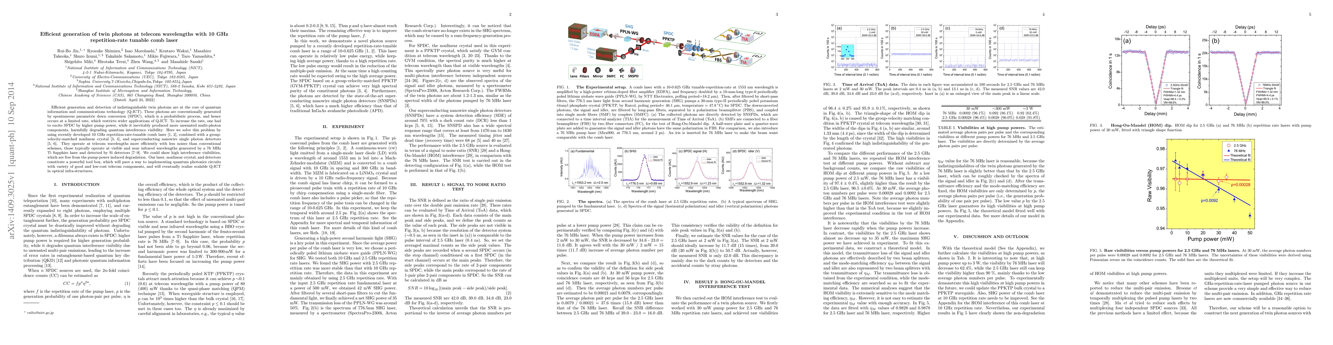 This paper presents an efficient method for generating twin photons at telecom wavelengths using a 10 GHz repetition-rate tunable comb laser, which significantly improves the rate and quality of photon generation compared to conventional methods. The new setup achieves high interference visibility without the degradation typically caused by higher pump power, paving the way for scalable quantum information and communication technology.