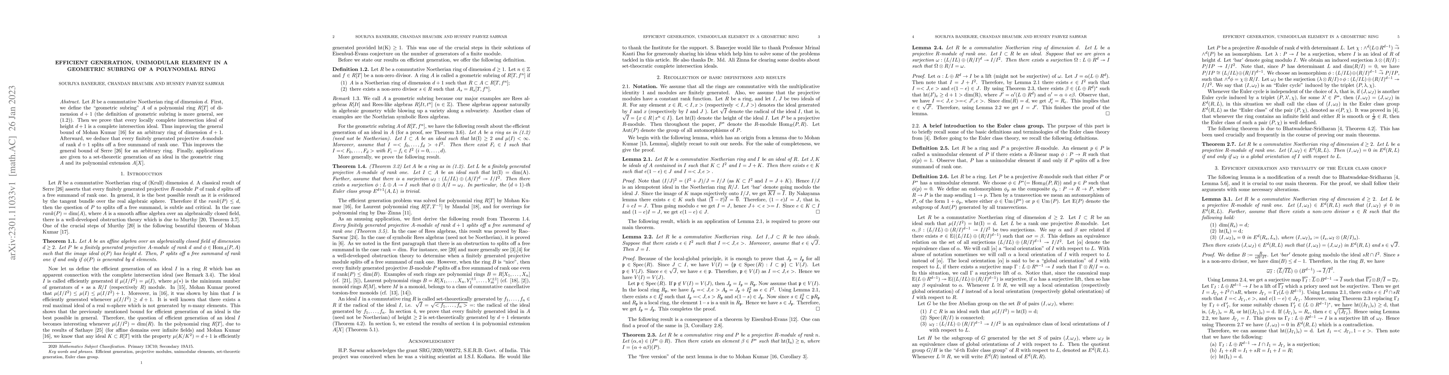 This paper defines a "geometric subring" $A$ of a polynomial ring $R[T]$ and proves that every locally complete intersection ideal of height $d+1$ is a complete intersection ideal, improving bounds set by Mohan Kumar and Serre. It also shows that every finitely generated projective $A$-module of rank $d+1$ splits off a free summand of rank one.