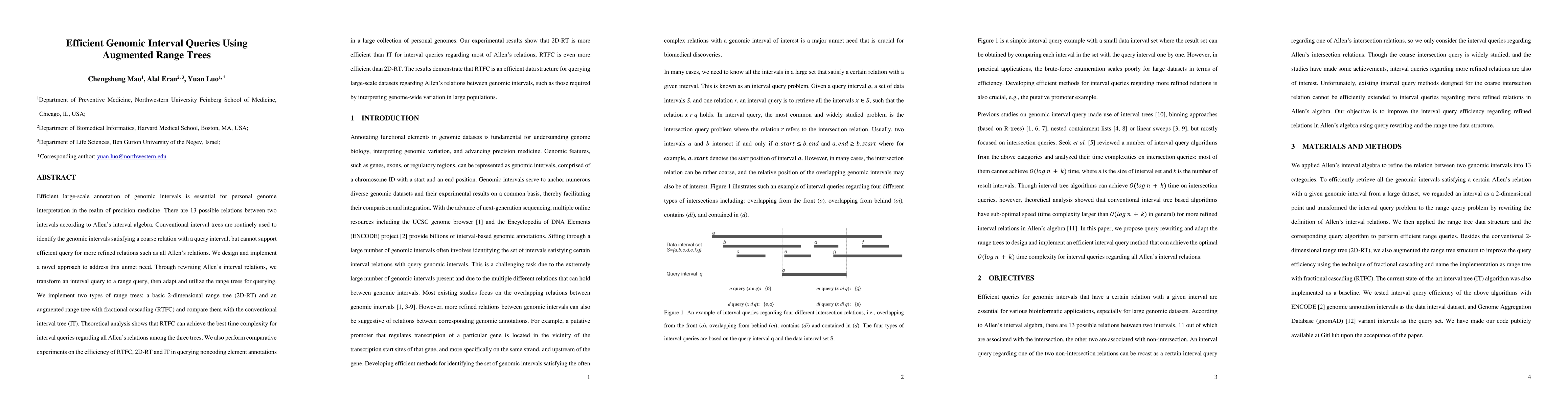 This work is novel in its application of fractional cascading to range trees for efficient genomic interval queries, addressing the limitations of conventional interval trees in handling refined interval relations.