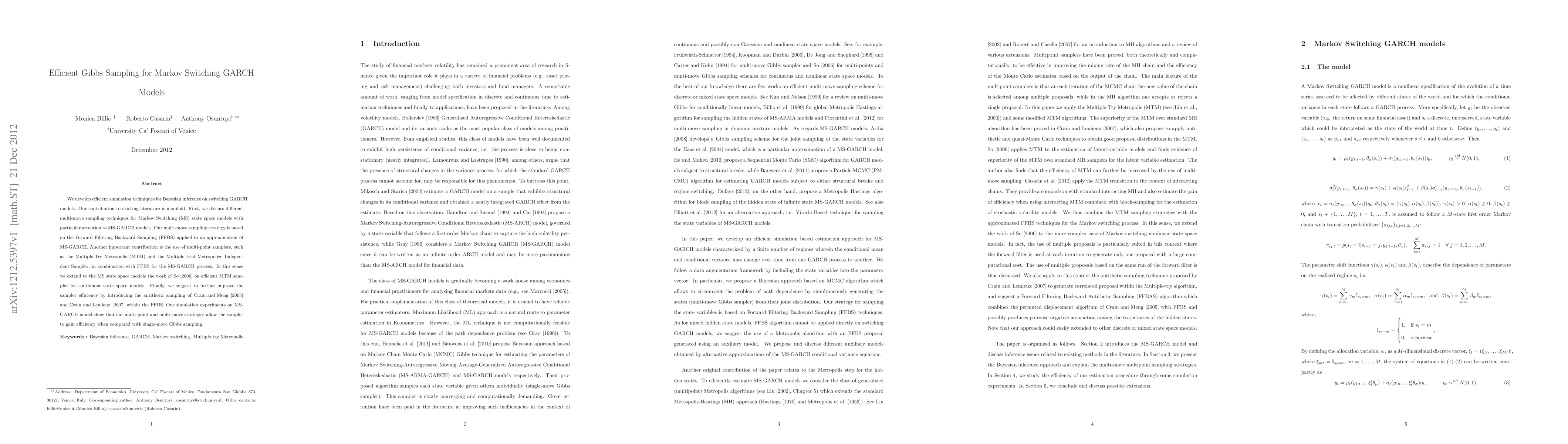 This paper develops efficient simulation techniques for Bayesian inference on Markov Switching GARCH models, utilizing multi-move sampling strategies and multi-point samplers like the Multiple-Try Metropolis, alongside antithetic sampling to improve efficiency over traditional Gibbs sampling. Simulation results demonstrate significant efficiency gains.