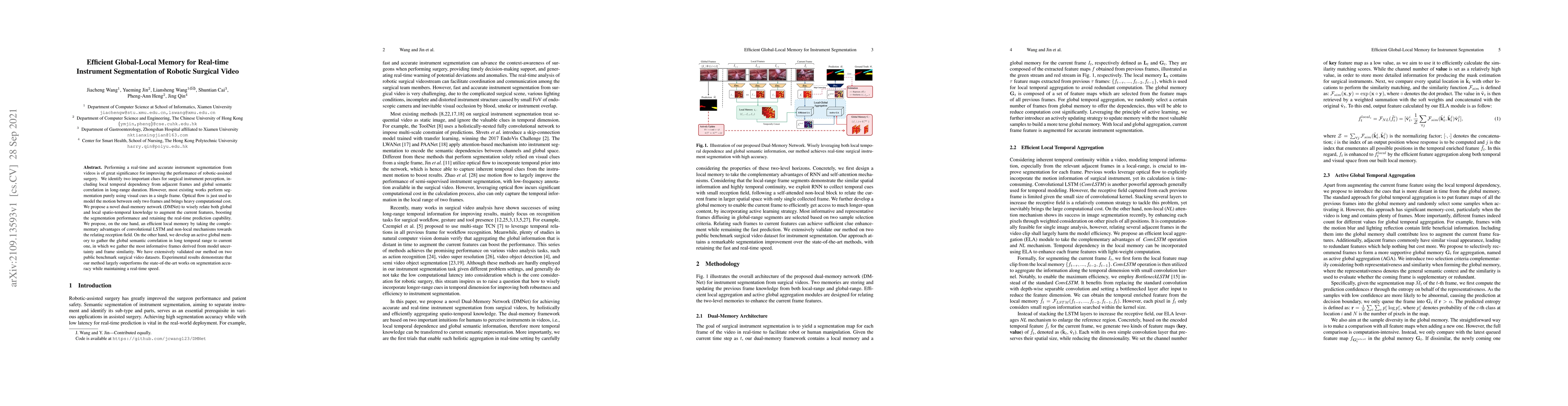 This research introduces a dual-memory network (DMNet) to enhance real-time instrument segmentation in robotic surgical videos by combining local temporal dependencies and global semantic correlations. The proposed method uses efficient local memory and active global memory to improve segmentation accuracy while maintaining real-time performance.