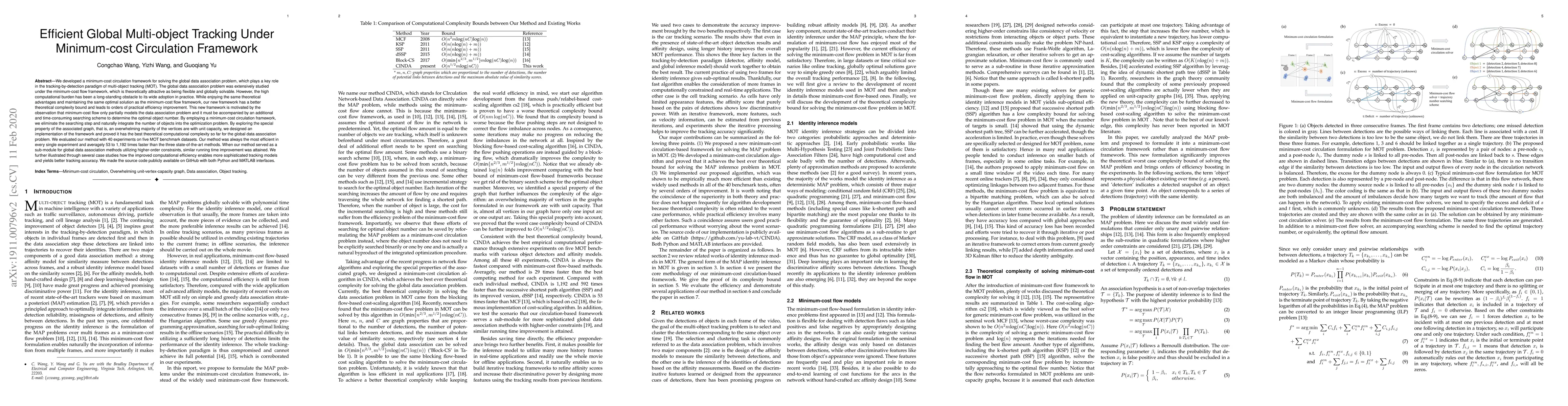 We developed a minimum-cost circulation framework for solving the global data association problem, which plays a key role in the tracking-by-detection paradigm of multi-object tracking. The global data association problem was extensively studied under the minimum-cost flow framework, which is theoretically attractive as being flexible and globally solvable. However, the high computational burden has been a long-standing obstacle to its wide adoption in practice. While enjoying the same theoretical advantages and maintaining the same optimal solution as the minimum-cost flow framework, our new framework has a better theoretical complexity bound and leads to orders of practical efficiency improvement. This new framework is motivated by the observation that minimum-cost flow only partially models the data association problem and must be accompanied by an additional and time-consuming searching scheme to determine the optimal object number. By employing a minimum-cost circulation framework, we eliminate the searching step and naturally integrate the number of objects into the optimization problem. By exploring the special property of the associated graph, that is, an overwhelming majority of the vertices are with unit capacity, we designed an implementation of the framework and proved it has the best theoretical complexity so far for the global data association problem. We evaluated our method with 40 experiments on five MOT benchmark datasets. Our method was always the most efficient and averagely 53 to 1,192 times faster than the three state-of-the-art methods. When our method served as a sub-module for global data association methods using higher-order constraints, similar efficiency improvement was attained. We further illustrated through several case studies how the improved computational efficiency enables more sophisticated tracking models and yields better tracking accuracy.