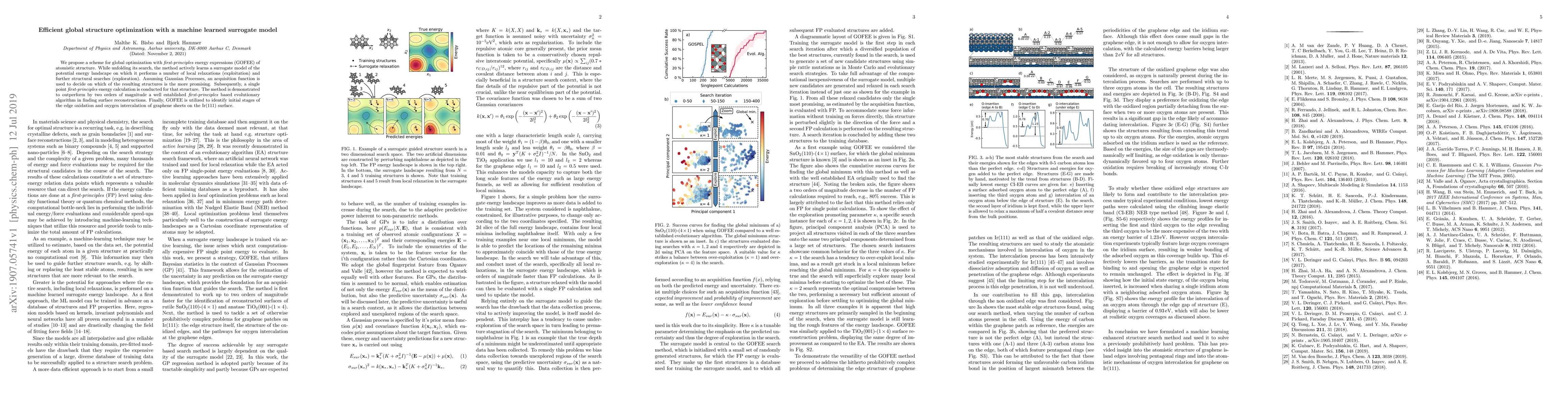 We propose a scheme for global optimization with first-principles energy expressions (GOFEE) of atomistic structure. While unfolding its search, the method actively learns a surrogate model of the potential energy landscape on which it performs a number of local relaxations (exploitation) and further structural searches (exploration). Assuming Gaussian Processes, an acquisition function is used to decide on which of the resulting structures is the more promising. Subsequently, a single point first-principles energy calculation is conducted for that structure. The method is demonstrated to outperform by two orders of magnitude a well established first-principles based evolutionary algorithm in finding surface reconstructions. Finally, GOFEE is utilized to identify initial stages of the edge oxidation and oxygen intercalation of graphene sheets on the Ir(111) surface.