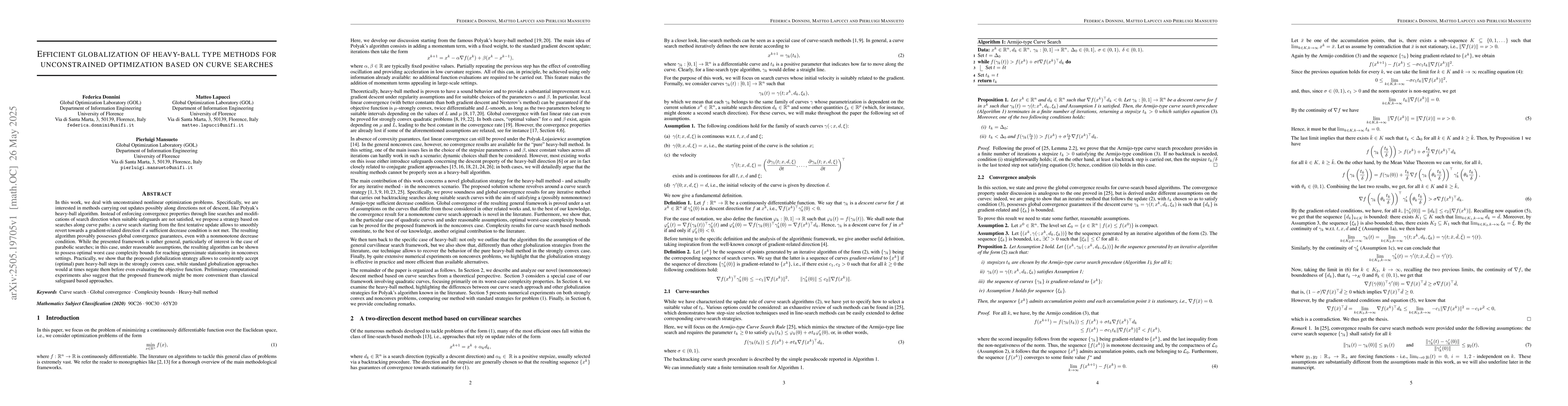 The research proposes a curve search-based globalization strategy for heavy-ball type methods in unconstrained nonlinear optimization, avoiding line searches and direction modifications when safeguards aren't met.