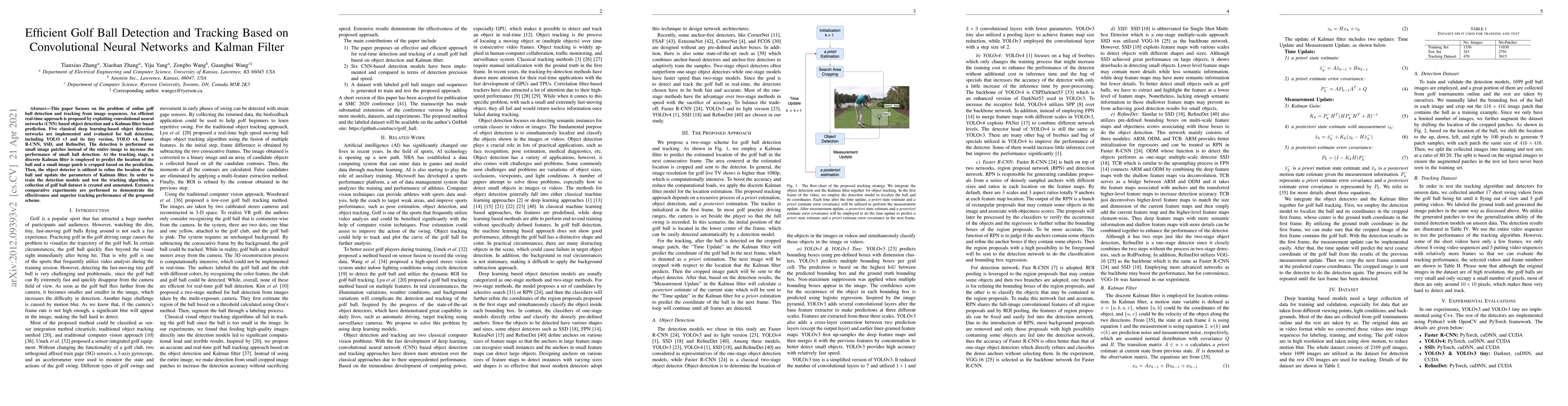 This paper proposes an efficient real-time golf ball detection and tracking system using convolutional neural networks for object detection and a Kalman filter for prediction. Comparative experiments show superior performance over classical deep learning-based detectors.