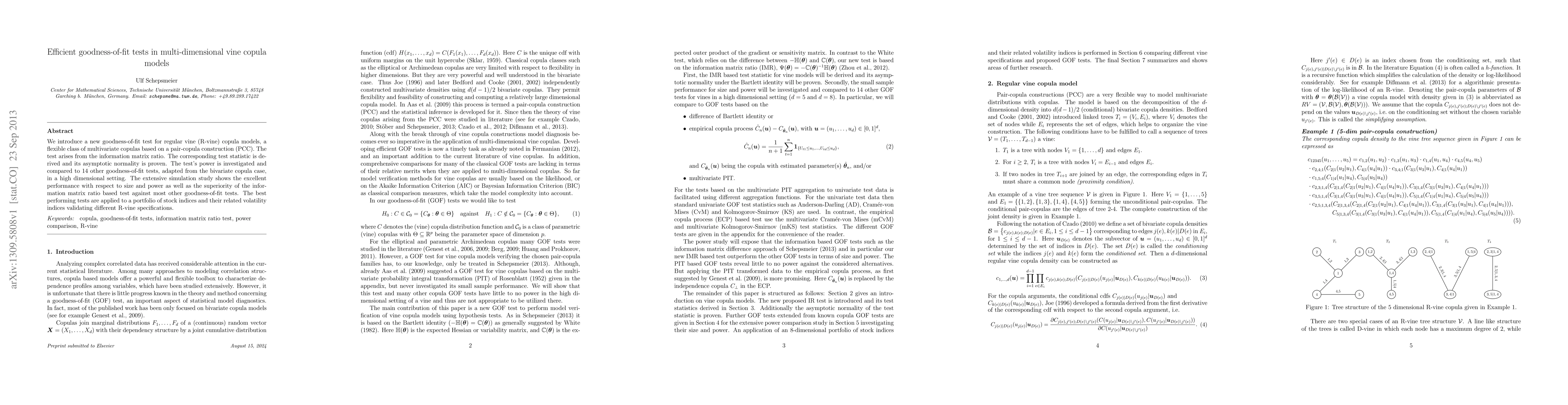 We introduce a new goodness-of-fit test for regular vine (R-vine) copula models, a flexible class of multivariate copulas based on a pair-copula construction (PCC). The test arises from the information matrix ratio. The corresponding test statistic is derived and its asymptotic normality is proven. The test's power is investigated and compared to 14 other goodness-of-fit tests, adapted from the bivariate copula case, in a high dimensional setting. The extensive simulation study shows the excellent performance with respect to size and power as well as the superiority of the information matrix ratio based test against most other goodness-of-fit tests. The best performing tests are applied to a portfolio of stock indices and their related volatility indices validating different R-vine specifications.
