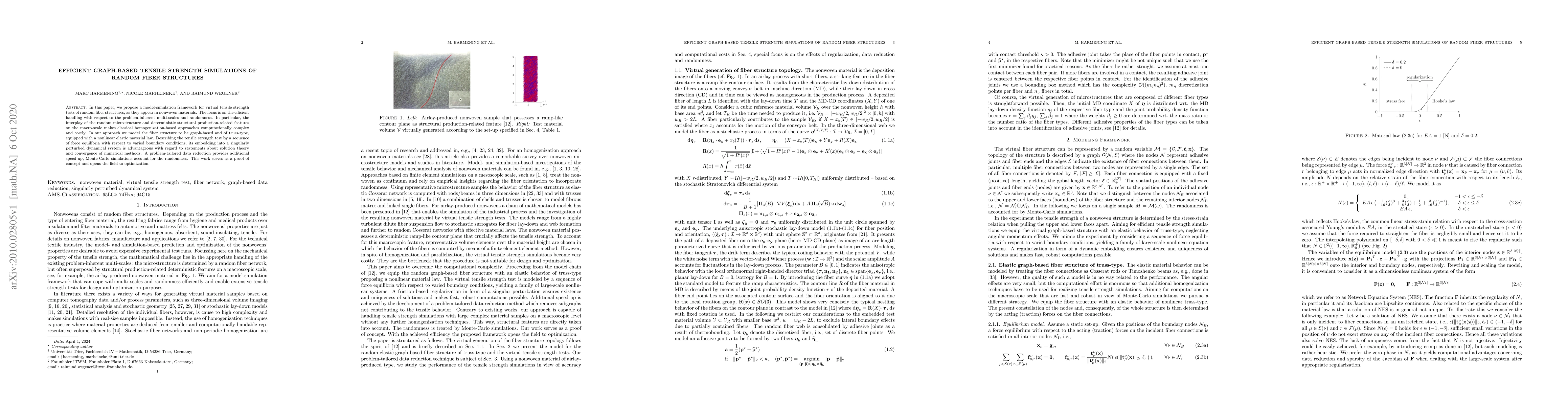 This paper proposes a graph-based simulation framework for efficient tensile strength testing of random fiber structures in nonwoven materials, addressing multi-scale complexity and randomness. The approach leverages graph modeling, nonlinear elasticity, and data reduction to optimize computational efficiency.