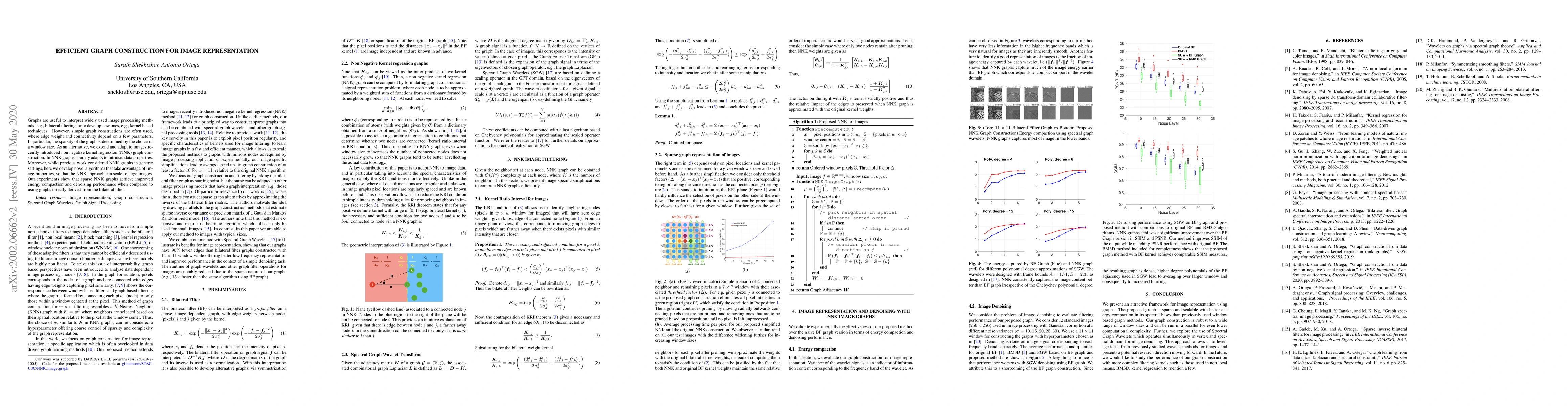 Graphs are useful to interpret widely used image processing methods, e.g., bilateral filtering, or to develop new ones, e.g., kernel based techniques. However, simple graph constructions are often used, where edge weight and connectivity depend on a few parameters. In particular, the sparsity of the graph is determined by the choice of a window size. As an alternative, we extend and adapt to images recently introduced non negative kernel regression (NNK) graph construction. In NNK graphs sparsity adapts to intrinsic data properties. Moreover, while previous work considered NNK graphs in generic settings, here we develop novel algorithms that take advantage of image properties so that the NNK approach can scale to large images. Our experiments show that sparse NNK graphs achieve improved energy compaction and denoising performance when compared to using graphs directly derived from the bilateral filter.