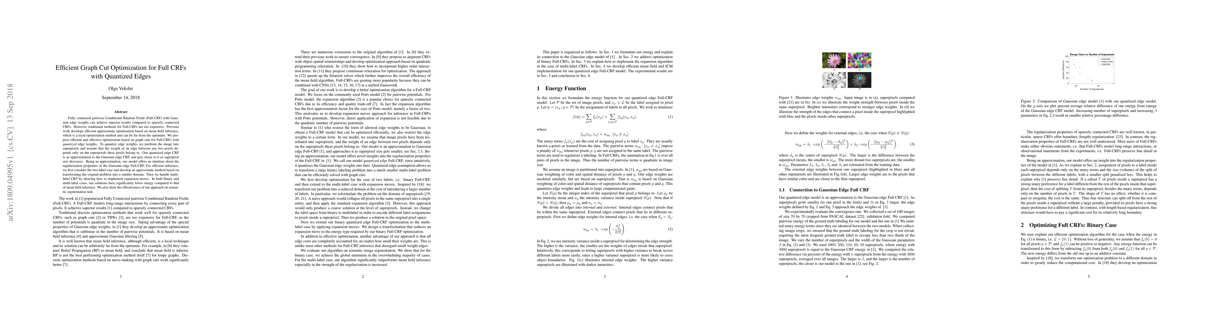 Researchers propose an efficient optimization method for Full CRFs with quantized edges using graph cuts, achieving lower energy than traditional mean field inference methods. The approach is effective in both binary and multi-label cases and shows promising results in semantic segmentation tasks.