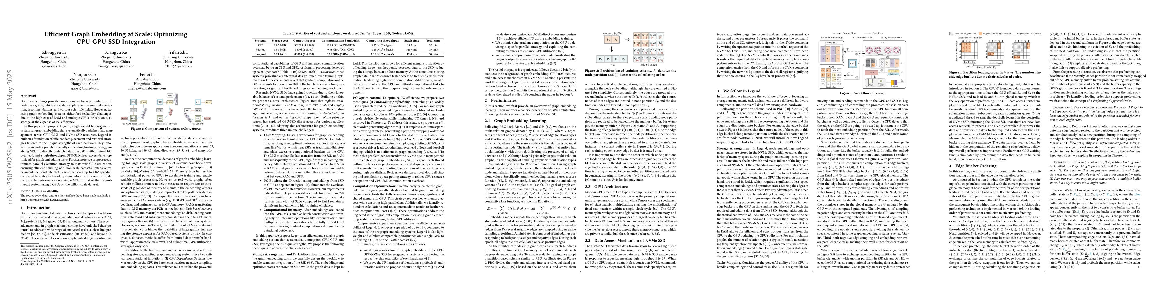 Legend's key technical contributions include a prefetch-friendly data loading strategy, a high-throughput GPU-SSD direct access driver, and a customized parallel execution strategy for efficient GPU utilization.