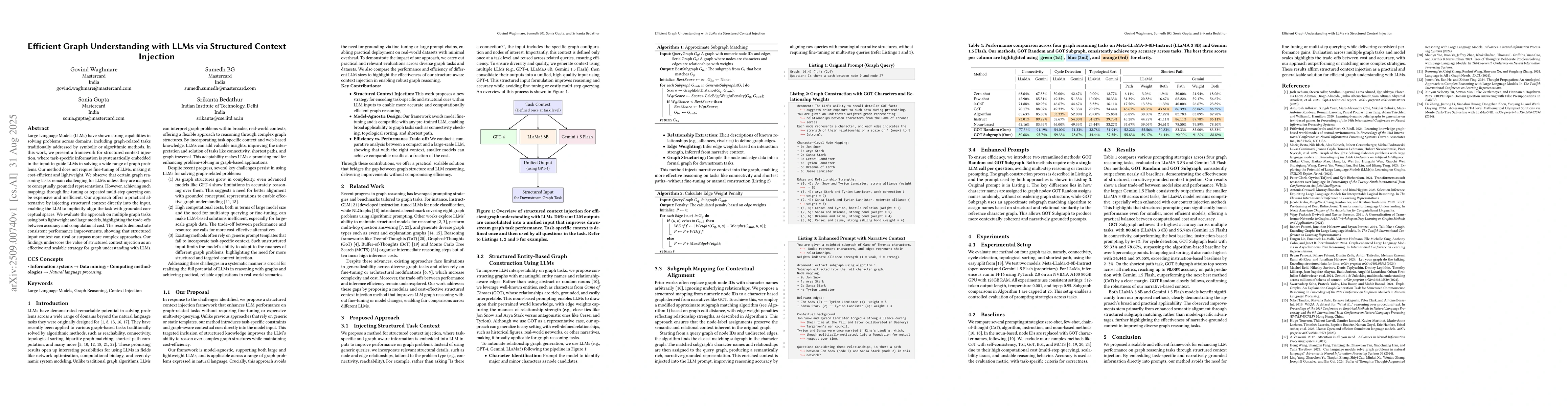 Large Language Models (LLMs) have shown strong capabilities in solving problems across domains, including graph-related tasks traditionally addressed by symbolic or algorithmic methods. In this work, we present a framework for structured context injection, where task-specific information is systematically embedded in the input to guide LLMs in solving a wide range of graph problems. Our method does not require fine-tuning of LLMs, making it cost-efficient and lightweight. We observe that certain graph reasoning tasks remain challenging for LLMs unless they are mapped to conceptually grounded representations. However, achieving such mappings through fine-tuning or repeated multi-step querying can be expensive and inefficient. Our approach offers a practical alternative by injecting structured context directly into the input, enabling the LLM to implicitly align the task with grounded conceptual spaces. We evaluate the approach on multiple graph tasks using both lightweight and large models, highlighting the trade-offs between accuracy and computational cost. The results demonstrate consistent performance improvements, showing that structured input context can rival or surpass more complex approaches. Our findings underscore the value of structured context injection as an effective and scalable strategy for graph understanding with LLMs.