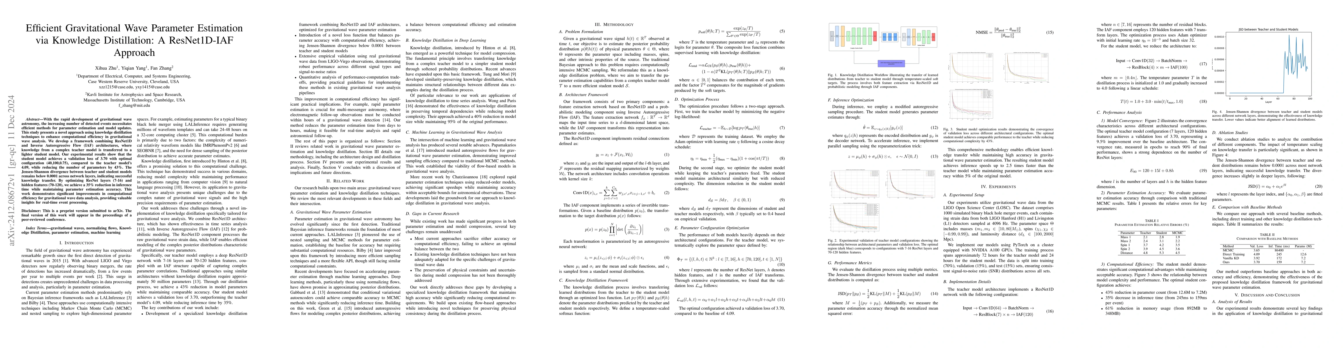 This paper introduces a knowledge distillation method combining ResNet1D and Inverse Autoregressive Flow to enhance gravitational wave parameter estimation efficiency. The student model achieves comparable accuracy to the teacher model while reducing parameters by 43% and inference time by 35%.