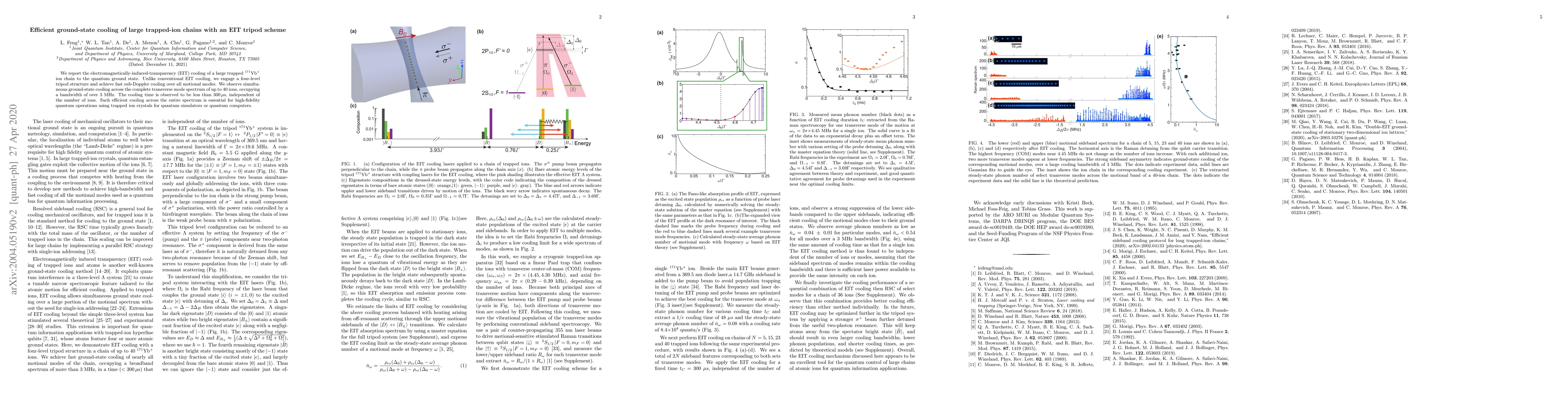 This paper demonstrates efficient ground-state cooling of a large trapped-ion chain using an EIT tripod scheme, achieving sub-Doppler cooling for all motional modes in less than 300 µs. The method enables simultaneous cooling of up to 40 ions across a 3 MHz bandwidth, crucial for quantum operations in quantum simulators or computers.