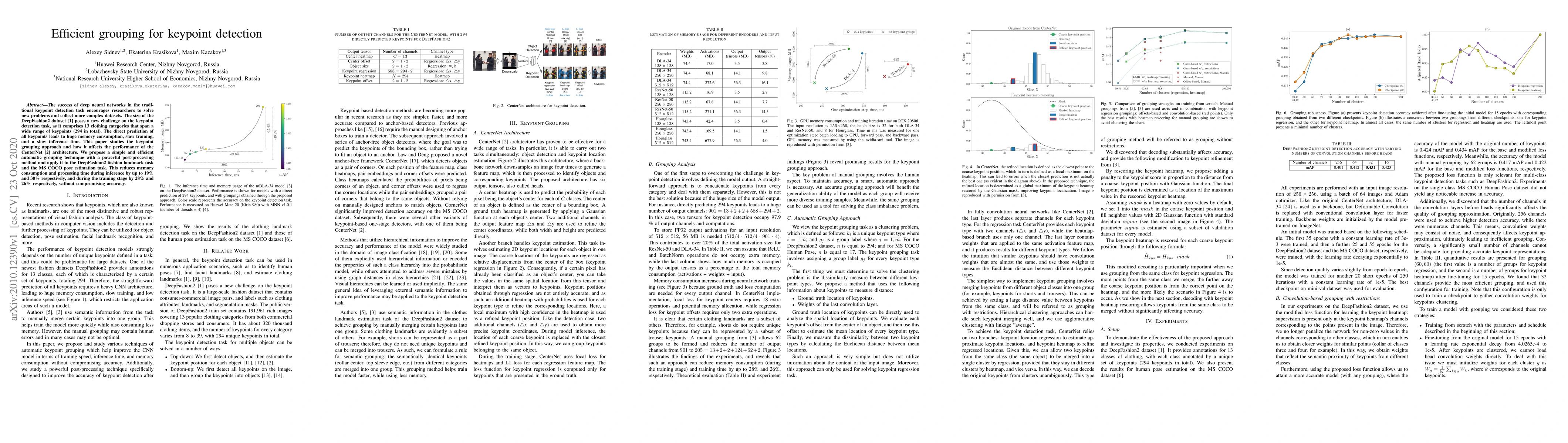 This paper proposes an efficient keypoint grouping technique to improve the performance of CenterNet for large datasets like DeepFashion2 and MS COCO. The method reduces memory usage and processing time by up to 19% and 30% during inference, and by 28% and 26% during training, without sacrificing accuracy.