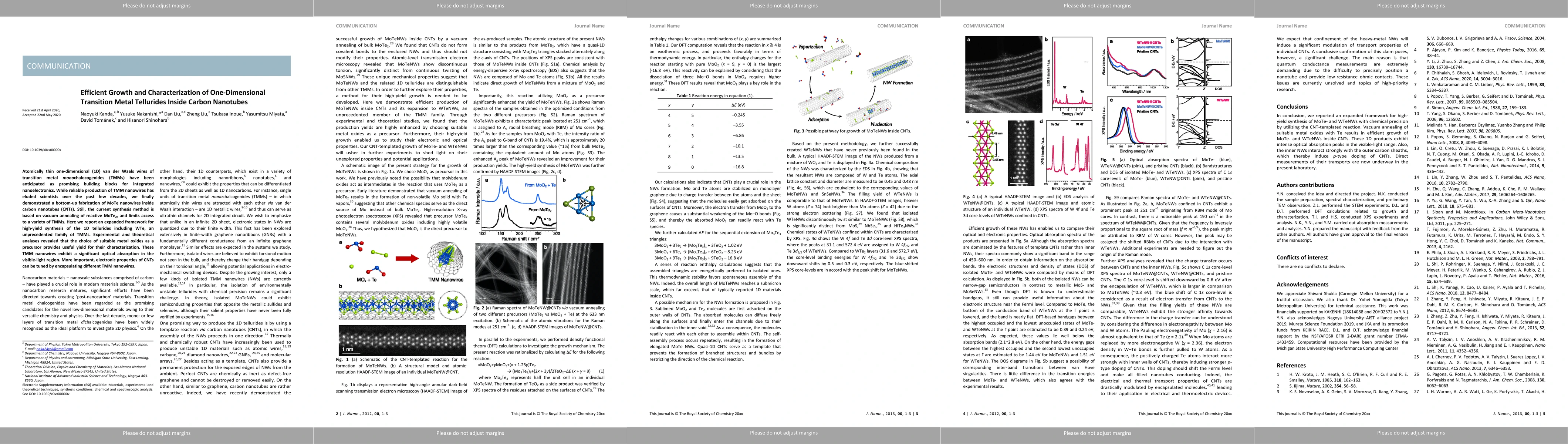 This paper details the successful bottom-up synthesis of one-dimensional transition metal tellurides (TMMs) within carbon nanotubes, expanding the method to include WTe. The study highlights the use of metal oxides as precursors and demonstrates the tunable electronic properties of carbon nanotubes when encapsulated with these TMM nanowires.