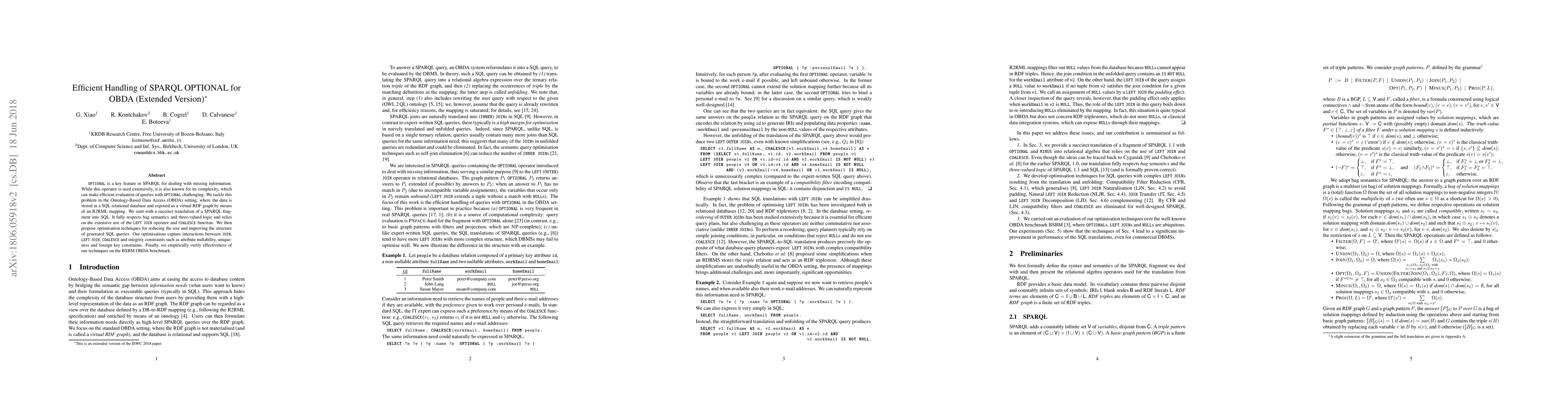 This paper proposes efficient techniques for handling SPARQL OPTIONAL queries in the OBDA setting, translating SPARQL into optimized SQL queries that respect bag semantics and three-valued logic, using LEFT JOIN and COALESCE. It optimizes the SQL by considering JOIN interactions and integrity constraints, validated on the BSBM benchmark.