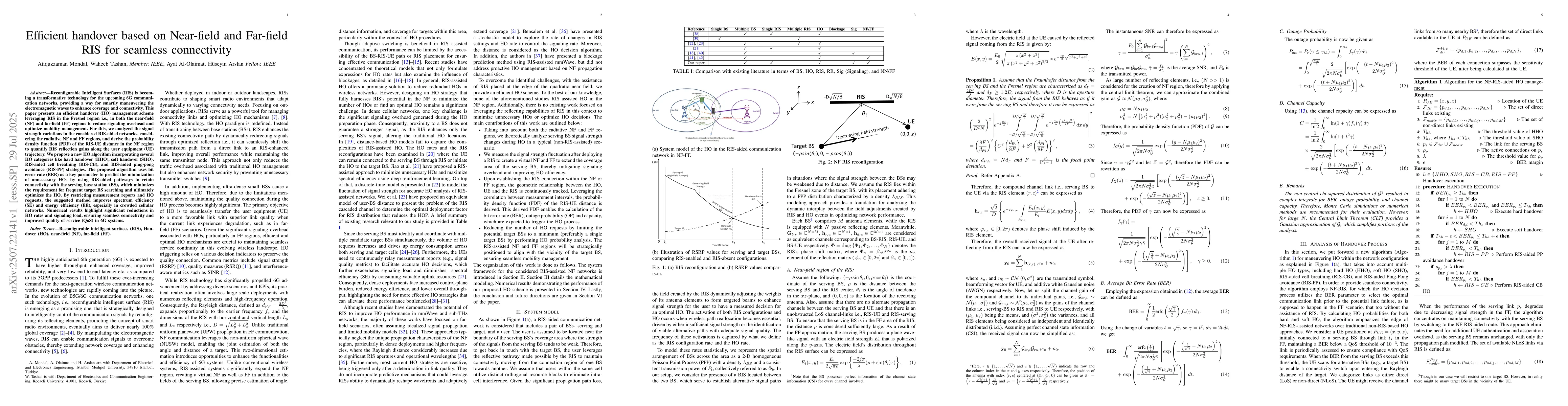 Reconfigurable Intelligent Surfaces (RIS) is becoming a transformative technology for the upcoming 6G communication networks, providing a way for smartly maneuvering the electromagnetic waves to enhance coverage and connectivity. This paper presents an efficient handover (HO) management scheme leveraging RIS in the Fresnel region i.e., in both the near-field (NF) and far-field (FF) regions to reduce signaling overhead and optimize mobility management. For this, we analyzed the signal strength variations in the considered RIS-aided networks, considering the radiative NF and FF regions, and derive the probability density function (PDF) of the RIS-UE distance in the NF region to quantify RIS reflection gains along the user equipment (UE) trajectory. We propose a new HO algorithm incorporating several HO categories like hard handover (HHO), soft handover (SHO), RIS-aided cell breathing (RIS-CB), and RIS-aided ping-pong avoidance (RIS-PP) strategies. The proposed algorithm uses bit error rate (BER) as a key parameter to predict the minimization of unnecessary HOs by using RIS-aided pathways to retain connectivity with the serving base station (BS), which minimizes the requirement for frequent target BS searching and ultimately optimizes the HO. By restricting measurement reports and HO requests, the suggested method improves spectrum efficiency (SE) and energy efficiency (EE), especially in crowded cellular networks. Numerical results highlight significant reductions in HO rates and signaling load, ensuring seamless connectivity and improved quality of service (QoS) in 6G systems.