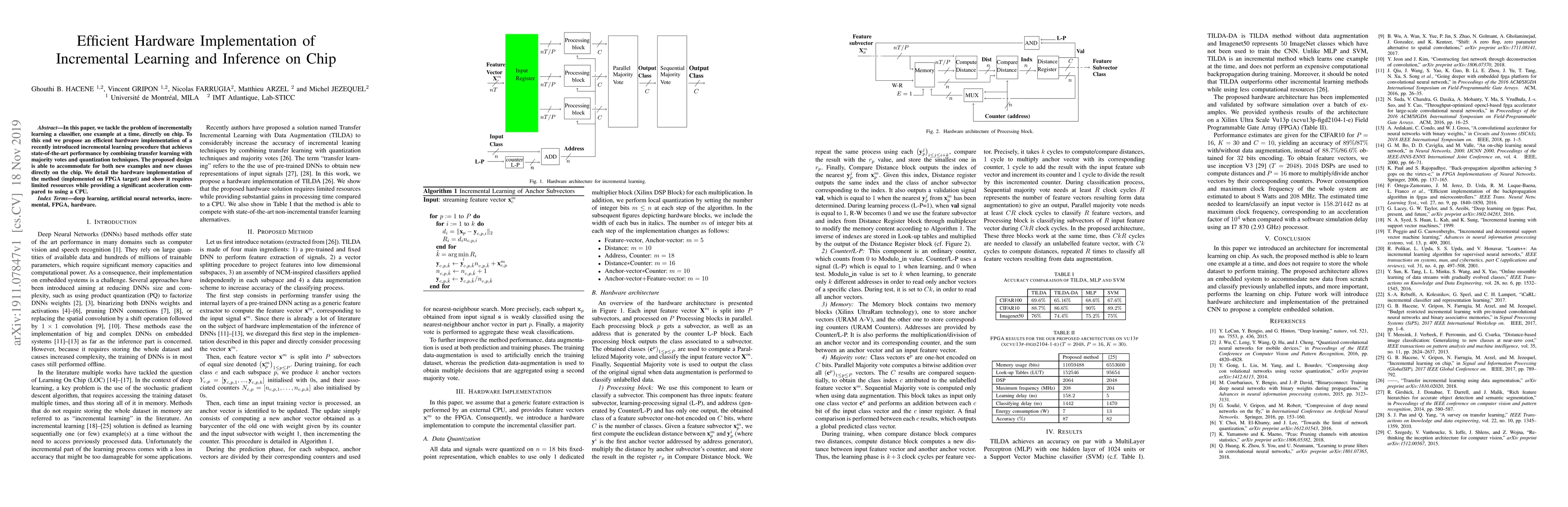 In this paper, we tackle the problem of incrementally learning a classifier, one example at a time, directly on chip. To this end, we propose an efficient hardware implementation of a recently introduced incremental learning procedure that achieves state-of-the-art performance by combining transfer learning with majority votes and quantization techniques. The proposed design is able to accommodate for both new examples and new classes directly on the chip. We detail the hardware implementation of the method (implemented on FPGA target) and show it requires limited resources while providing a significant acceleration compared to using a CPU.