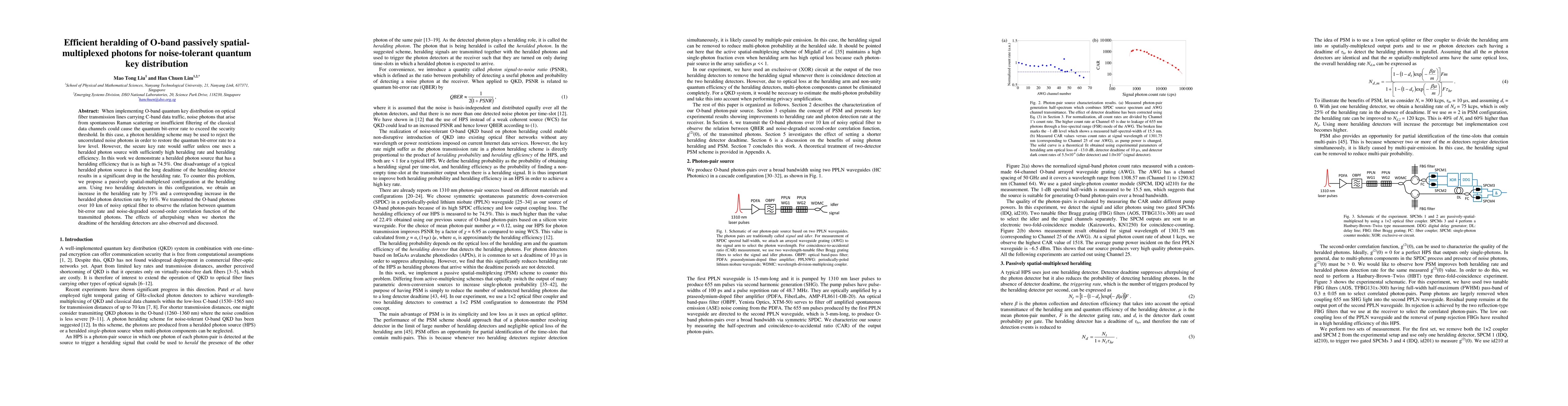 When implementing O-band quantum key distribution on optical fiber transmission lines carrying C-band data traffic, noise photons that arise from spontaneous Raman scattering or insufficient filtering of the classical data channels could cause the quantum bit-error rate to exceed the security threshold. In this case, a photon heralding scheme may be used to reject the uncorrelated noise photons in order to restore the quantum bit-error rate to a low level. However, the secure key rate would suffer unless one uses a heralded photon source with sufficiently high heralding rate and heralding efficiency. In this work we demonstrate a heralded photon source that has a heralding efficiency that is as high as 74.5%. One disadvantage of a typical heralded photon source is that the long deadtime of the heralding detector results in a significant drop in the heralding rate. To counter this problem, we propose a passively spatial-multiplexed configuration at the heralding arm. Using two heralding detectors in this configuration, we obtain an increase in the heralding rate by 37% and a corresponding increase in the heralded photon detection rate by 16%. We transmitted the O-band photons over 10 km of noisy optical fiber to observe the relation between quantum bit-error rate and noise-degraded second-order correlation function of the transmitted photons. The effects of afterpulsing when we shorten the deadtime of the heralding detectors are also observed and discussed.
