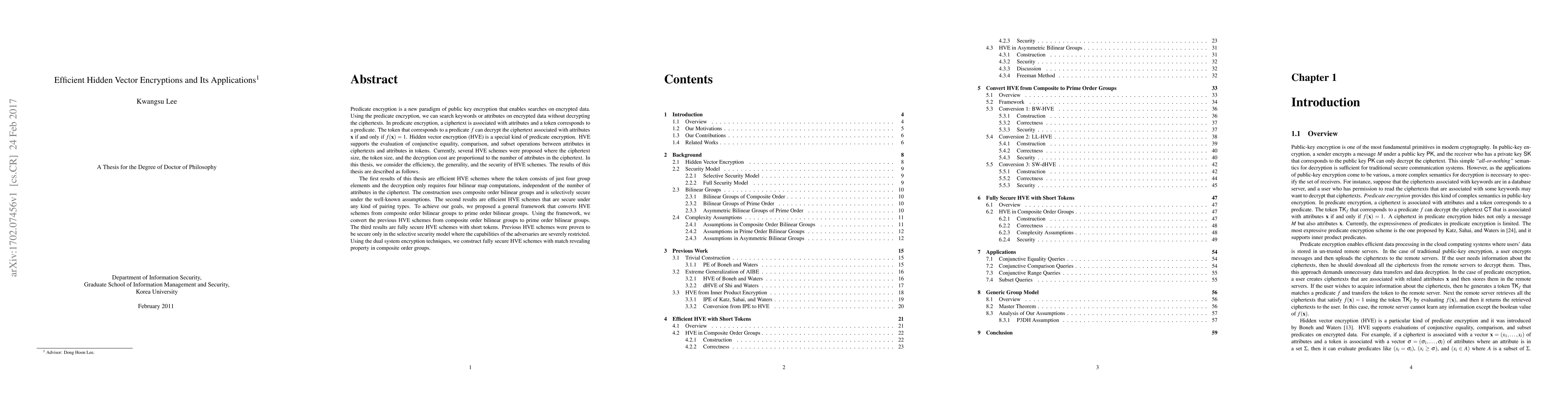 Predicate encryption is a new paradigm of public key encryption that enables searches on encrypted data. Using the predicate encryption, we can search keywords or attributes on encrypted data without decrypting the ciphertexts. In predicate encryption, a ciphertext is associated with attributes and a token corresponds to a predicate. The token that corresponds to a predicate $f$ can decrypt the ciphertext associated with attributes $x$ if and only if $f(x)=1$. Hidden vector encryption (HVE) is a special kind of predicate encryption. In this thesis, we consider the efficiency, the generality, and the security of HVE schemes. The results of this thesis are described as follows. The first results of this thesis are efficient HVE schemes where the token consists of just four group elements and the decryption only requires four bilinear map computations, independent of the number of attributes in the ciphertext. The construction uses composite order bilinear groups and is selectively secure under the well-known assumptions. The second results are efficient HVE schemes that are secure under any kind of pairing types. To achieve our goals, we proposed a general framework that converts HVE schemes from composite order bilinear groups to prime order bilinear groups. Using the framework, we convert the previous HVE schemes from composite order bilinear groups to prime order bilinear groups. The third results are fully secure HVE schemes with short tokens. Previous HVE schemes were proven to be secure only in the selective security model where the capabilities of the adversaries are severely restricted. Using the dual system encryption techniques, we construct fully secure HVE schemes with match revealing property in composite order groups.
