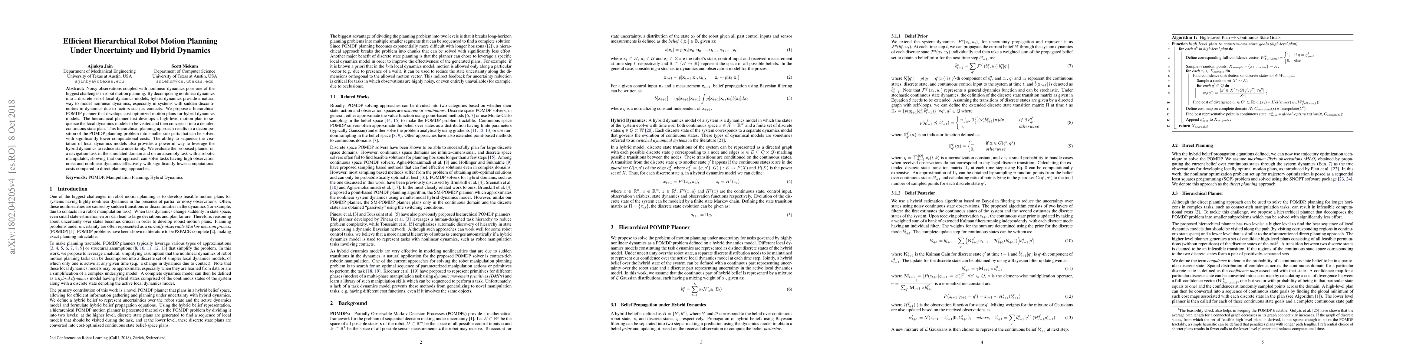 This paper proposes a hierarchical POMDP planner for efficient robot motion planning under uncertainty and hybrid dynamics, decomposing nonlinear dynamics into local models to reduce computational costs and uncertainty. The planner sequences the visitation of local dynamics models, demonstrating effectiveness in navigation and assembly tasks.