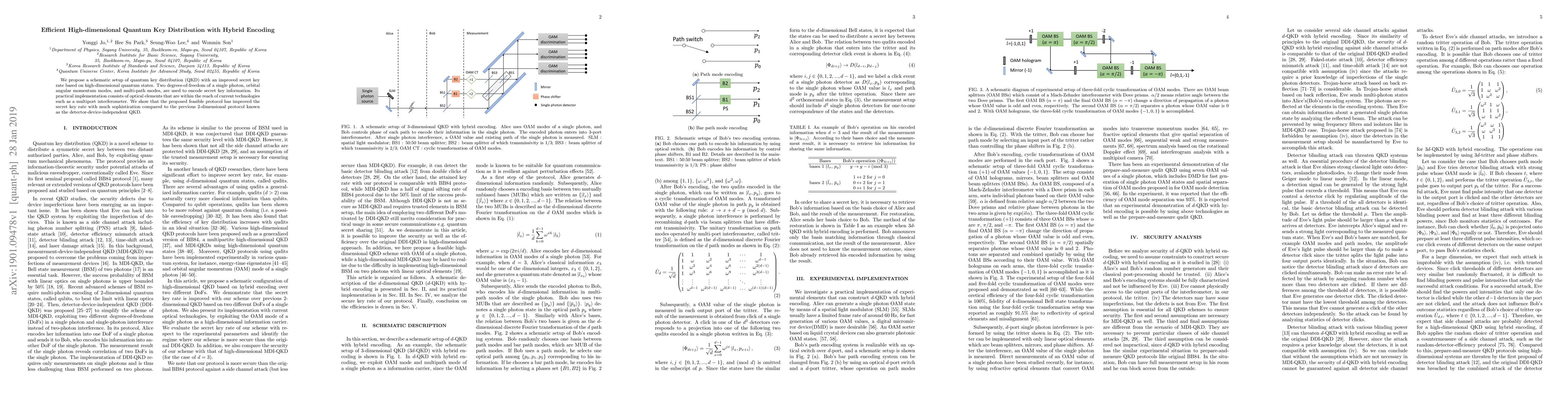 We propose a schematic setup of quantum key distribution (QKD) with an improved secret key rate based on high-dimensional quantum states. Two degrees-of-freedom of a single photon, orbital angular momentum modes, and multi-path modes, are used to encode secret key information. Its practical implementation consists of optical elements that are within the reach of current technologies such as a multiport interferometer. We show that the proposed feasible protocol has improved the secret key rate with much sophistication compared to the previous 2-dimensional protocol known as the detector-device-independent QKD.