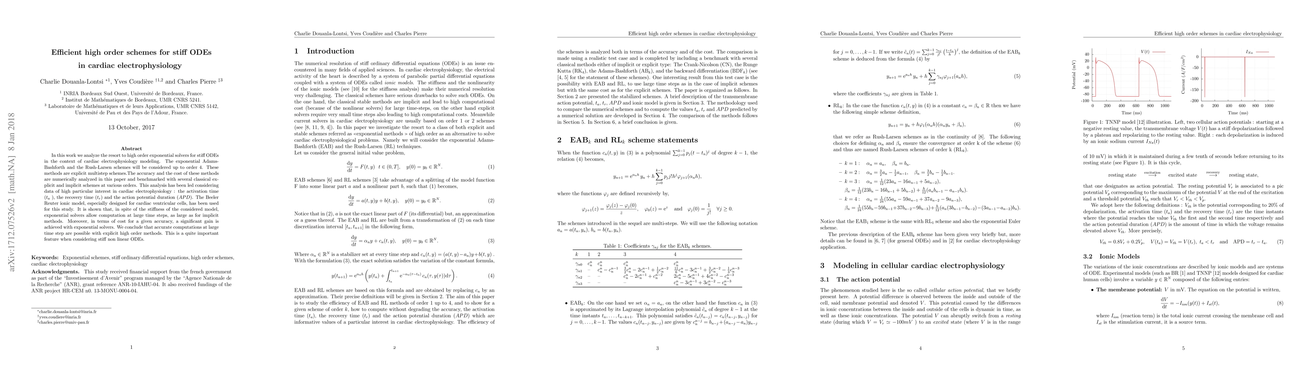This paper evaluates high order exponential solvers, specifically the exponential Adams-Bashforth and Rush-Larsen methods, for solving stiff ordinary differential equations in cardiac electrophysiology. The results show that these explicit multistep schemes can achieve significant computational efficiency compared to classical methods, while maintaining accuracy.