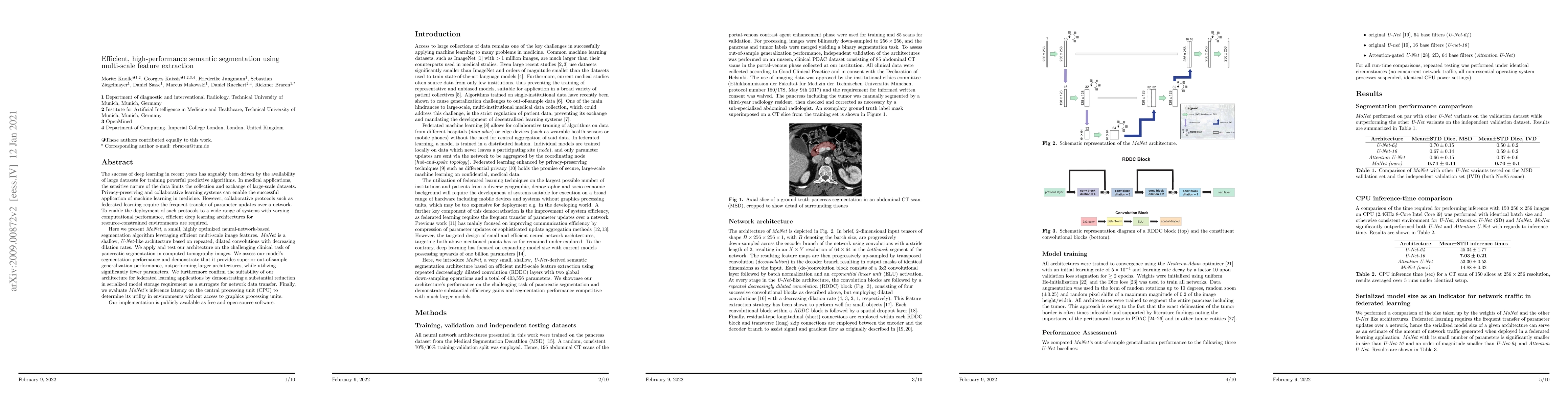 For artificial intelligence-based image analysis methods to reach clinical applicability, the development of high-performance algorithms is crucial. For example, existent segmentation algorithms based on natural images are neither efficient in their parameter use nor optimized for medical imaging. Here we present MoNet, a highly optimized neural-network-based pancreatic segmentation algorithm focused on achieving high performance by efficient multi-scale image feature utilization.