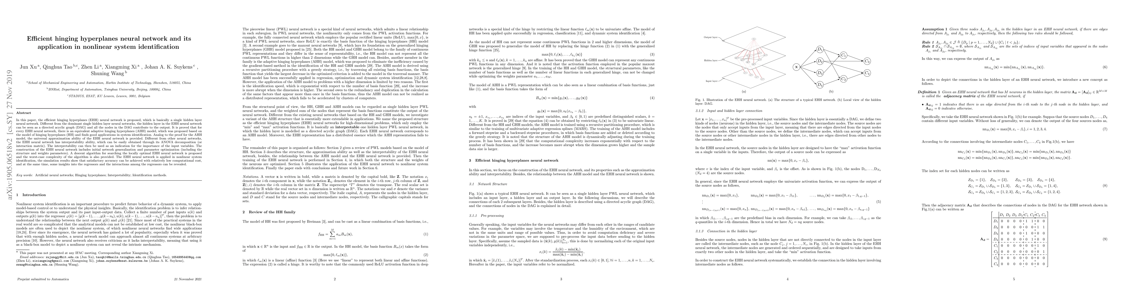 In this paper, the efficient hinging hyperplanes (EHH) neural network is proposed based on the model of hinging hyperplanes (HH). The EHH neural network is a distributed representation, the training of which involves solving several convex optimization problems and is fast. It is proved that for every EHH neural network, there is an equivalent adaptive hinging hyperplanes (AHH) tree, which was also proposed based on the model of HH and find good applications in system identification. The construction of the EHH neural network includes 2 stages. First the initial structure of the EHH neural network is randomly determined and the Lasso regression is used to choose the appropriate network. To alleviate the impact of randomness, secondly, the stacking strategy is employed to formulate a more general network structure. Different from other neural networks, the EHH neural network has interpretability ability, which can be easily obtained through its ANOVA decomposition (or interaction matrix). The interpretability can then be used as a suggestion for input variable selection. The EHH neural network is applied in nonlinear system identification, the simulation results show that the regression vector selected is reasonable and the identification speed is fast, while at the same time, the simulation accuracy is satisfactory.