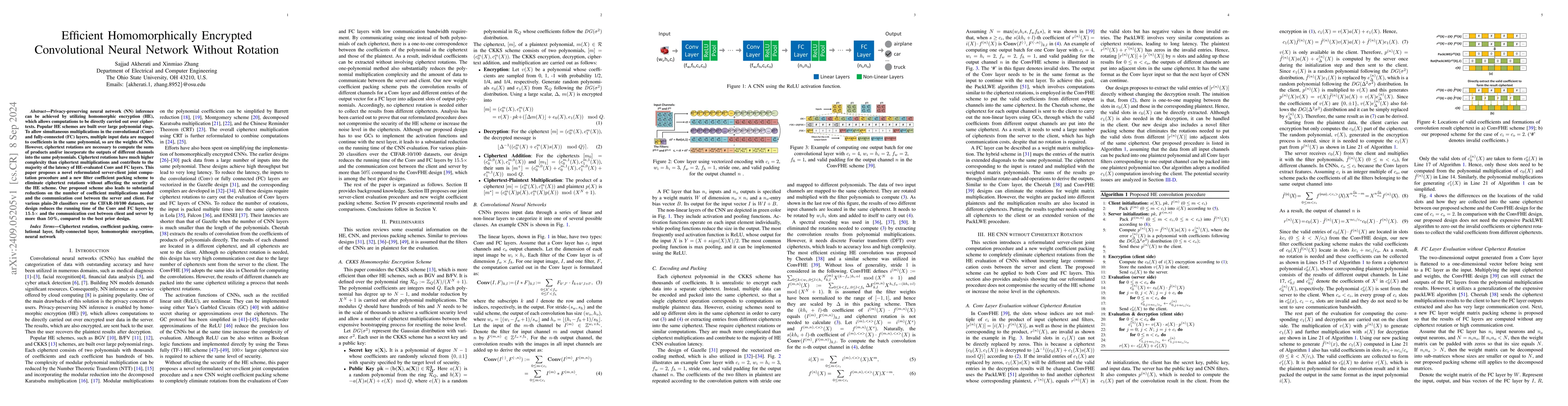 This paper presents a novel approach to perform homomorphically encrypted convolutional neural network (CNN) inference without ciphertext rotations, significantly reducing computational complexity and communication cost. The proposed method reformulates server-client joint computation and introduces a new filter coefficient packing scheme, achieving a 15.5% reduction in running time and over 50% decrease in communication costs compared to previous designs.