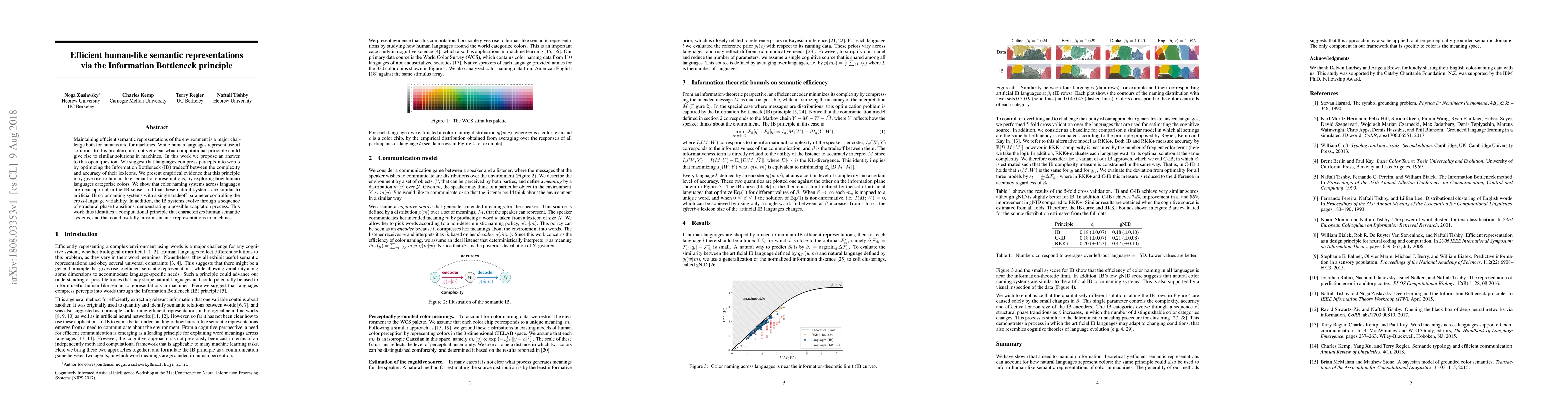Researchers propose that human semantic representations can be understood through the Information Bottleneck principle, which optimizes complexity vs accuracy in language lexicons. They show empirical evidence that natural color naming systems across languages follow this principle, mirroring artificial IB systems with a single tradeoff parameter.