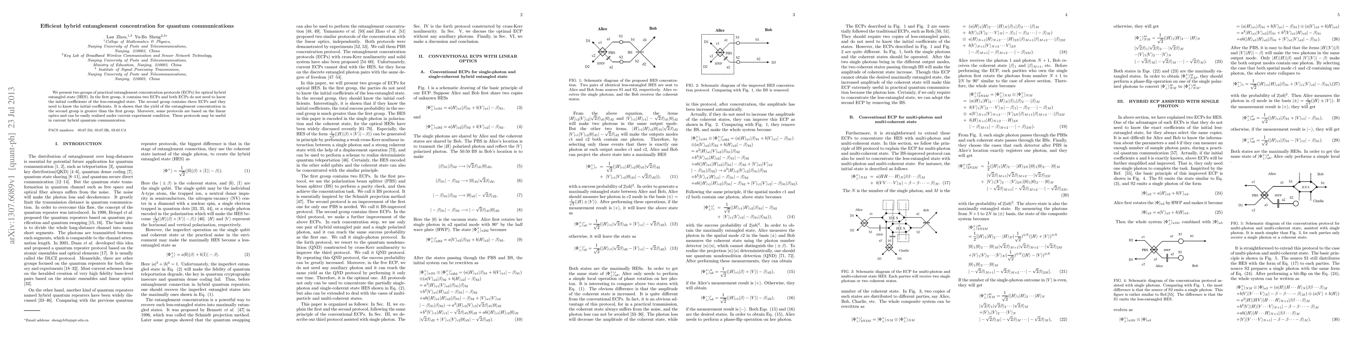 This paper introduces two sets of practical entanglement concentration protocols for optical hybrid entangled states, with the second group achieving higher yield and requiring knowledge of initial coefficients. Protocols based on linear optics are feasible with current experimental conditions, potentially enhancing hybrid quantum communication.
