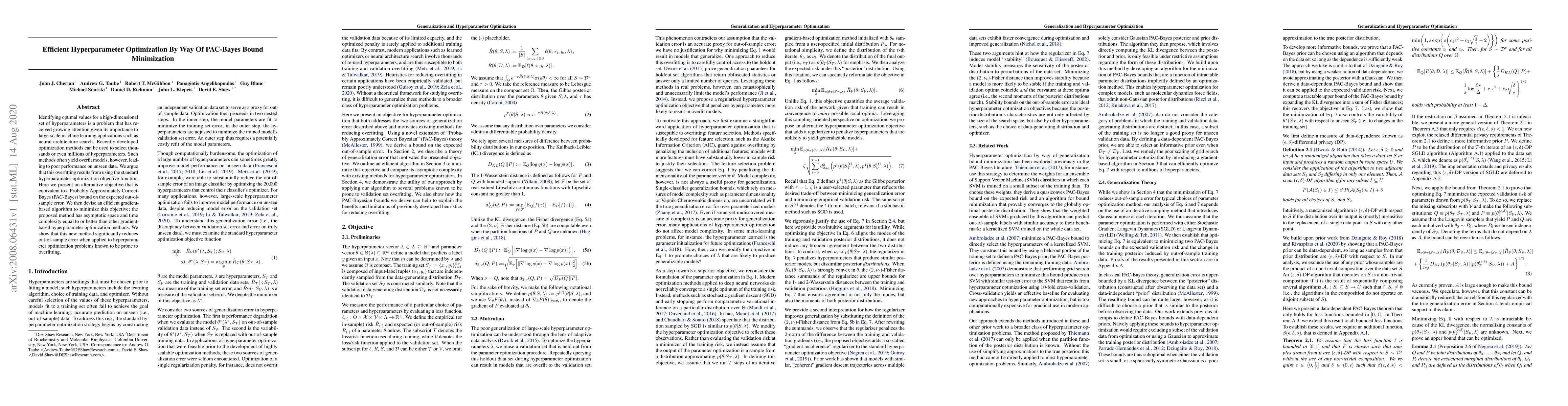 This paper proposes an alternative objective for hyperparameter optimization based on a PAC-Bayes bound to mitigate overfitting in large-scale machine learning applications. The authors introduce a gradient-based algorithm to minimize this new objective, demonstrating improved performance on unseen data compared to traditional methods.