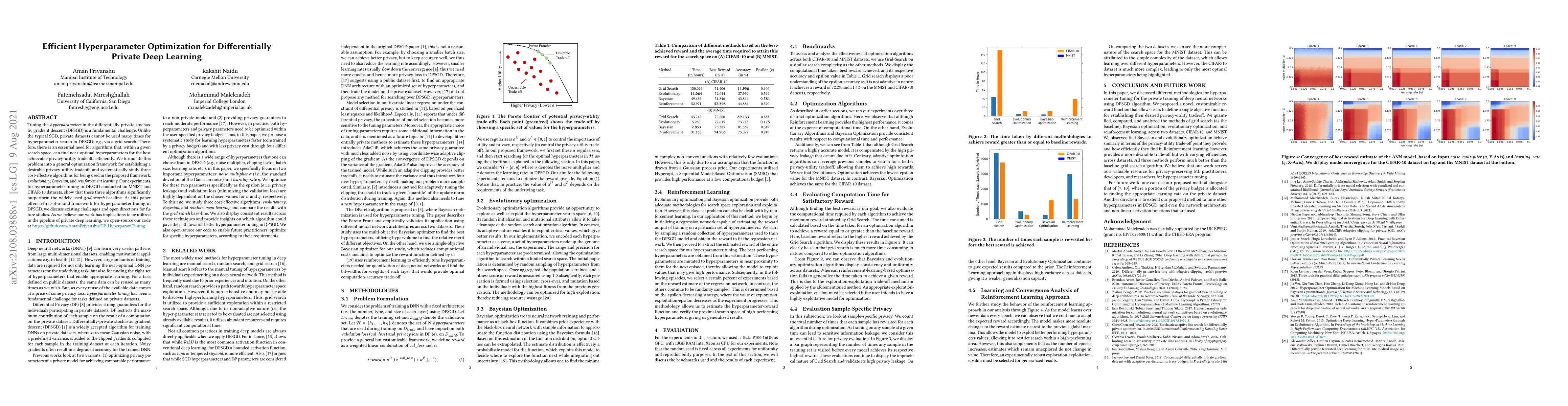 This paper proposes a framework for efficient hyperparameter optimization in differentially private stochastic gradient descent (DPSGD), introducing evolutionary, Bayesian, and reinforcement learning algorithms that outperform grid search. The experiments on MNIST and CIFAR-10 datasets demonstrate significant improvements, highlighting the potential for future studies in private deep learning.