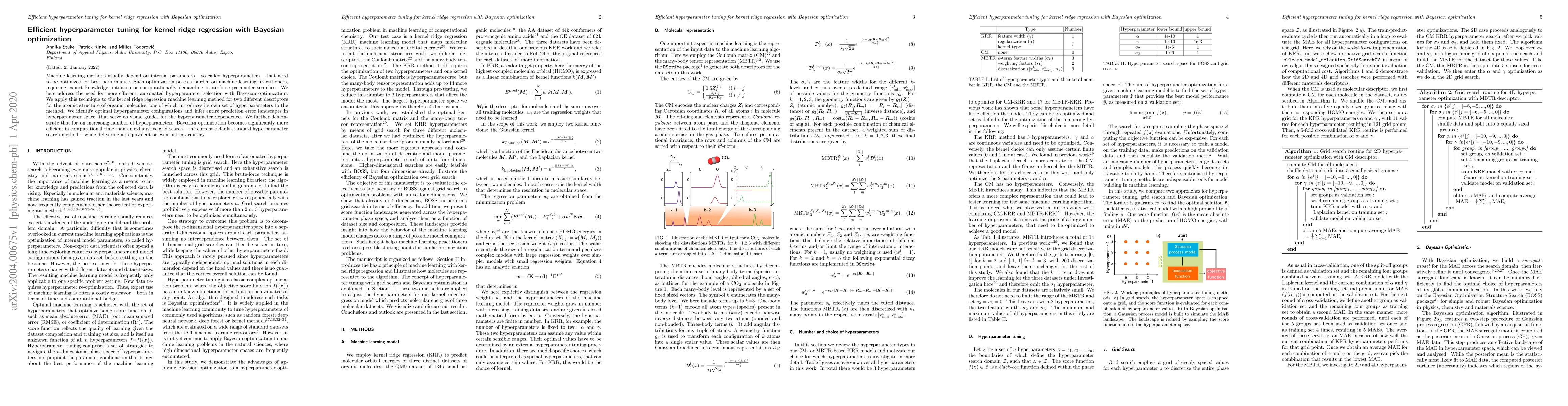 This paper proposes Bayesian optimization for efficient hyperparameter tuning in kernel ridge regression, comparing it against exhaustive grid search. The method is applied to organic molecule descriptors, showing improved efficiency and comparable or better accuracy for problems with many hyperparameters.