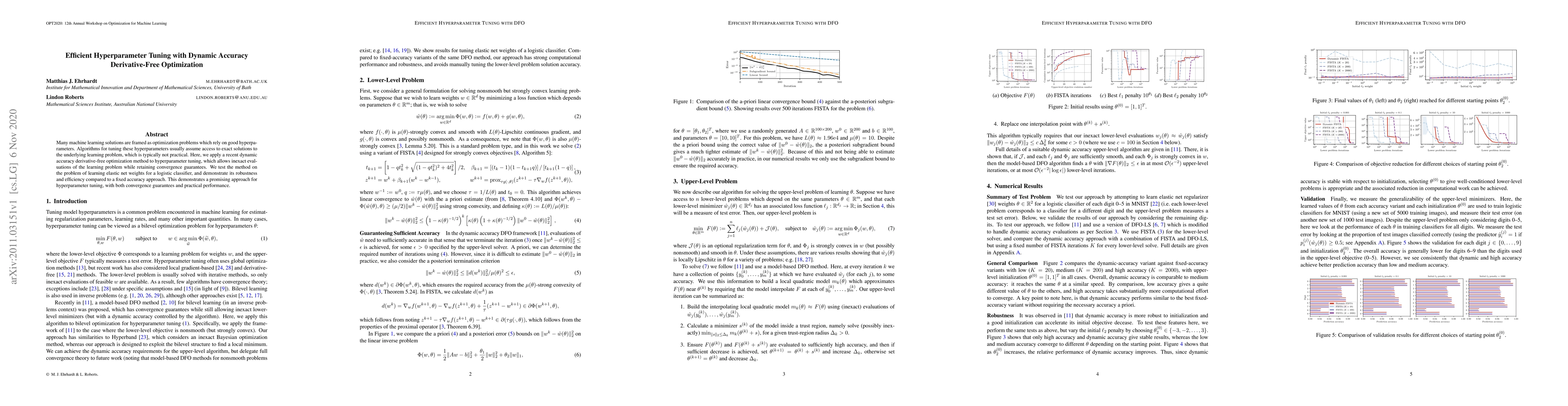 Many machine learning solutions are framed as optimization problems which rely on good hyperparameters. Algorithms for tuning these hyperparameters usually assume access to exact solutions to the underlying learning problem, which is typically not practical. Here, we apply a recent dynamic accuracy derivative-free optimization method to hyperparameter tuning, which allows inexact evaluations of the learning problem while retaining convergence guarantees. We test the method on the problem of learning elastic net weights for a logistic classifier, and demonstrate its robustness and efficiency compared to a fixed accuracy approach. This demonstrates a promising approach for hyperparameter tuning, with both convergence guarantees and practical performance.