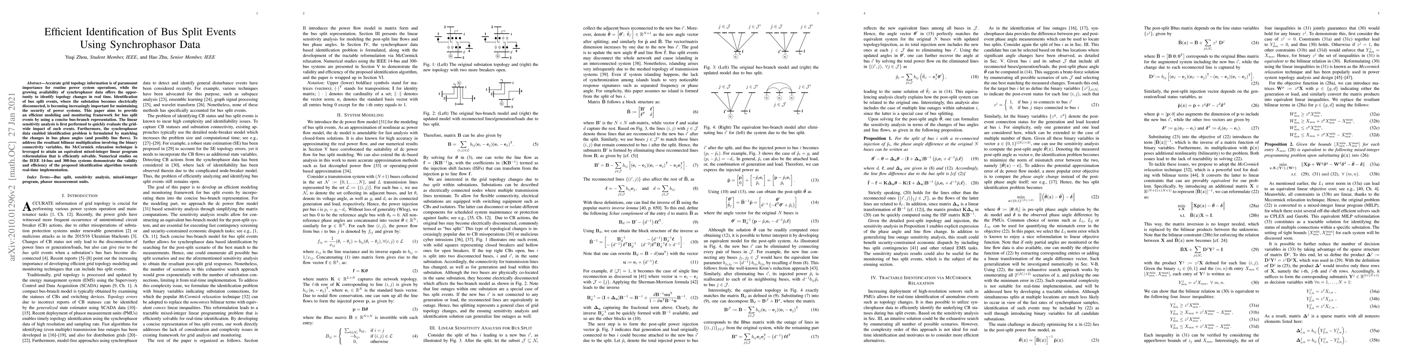This paper proposes an efficient framework for identifying bus split events in power grids using synchrophasor data, employing linear sensitivity analysis and a McCormick relaxation technique to convert the bilinear problem into a solvable mixed-integer linear program. Numerical results on IEEE 14-bus and 300-bus systems validate the method's effectiveness for real-time monitoring.