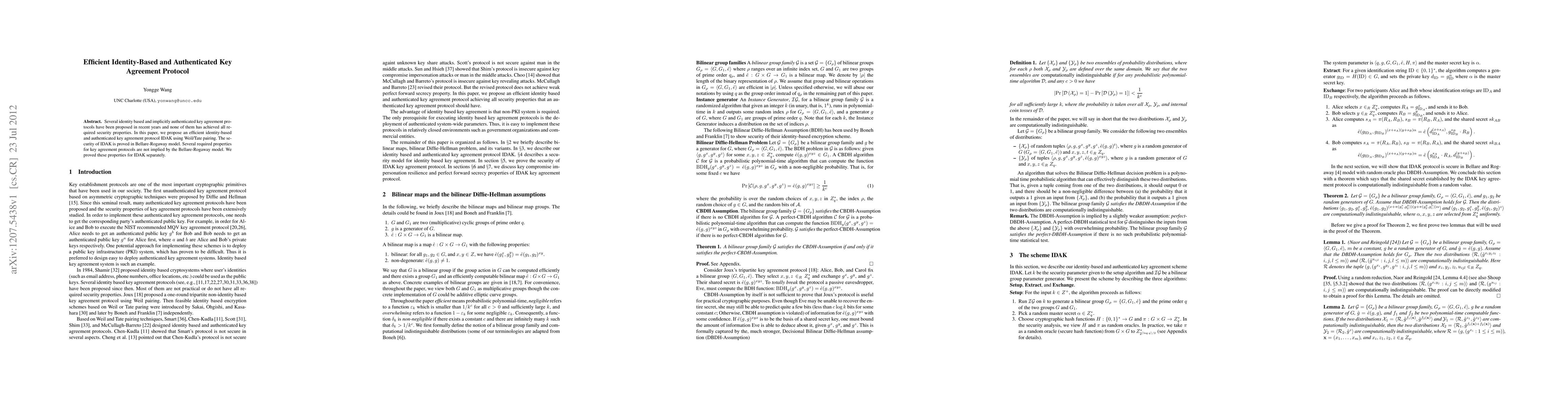 This paper proposes an efficient identity-based and authenticated key agreement protocol (IDAK) using Weil/Tate pairing, proving its security in the Bellare-Rogaway model and separately verifying additional required properties not inherently covered by the model.