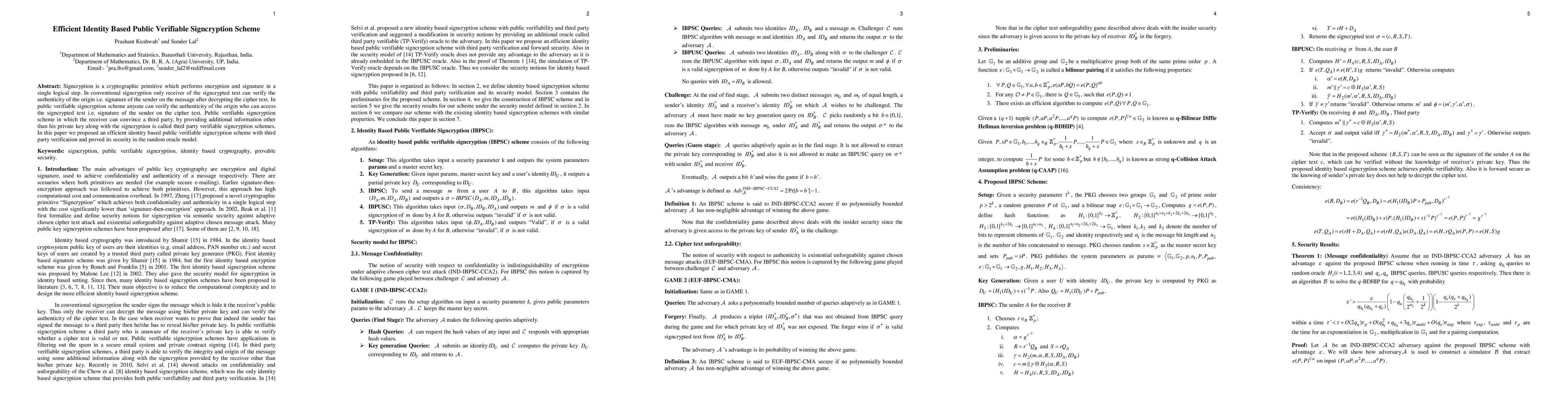 The proposed scheme is based on bilinear pairing and uses a signcryption approach with public verifiability and third-party verification.