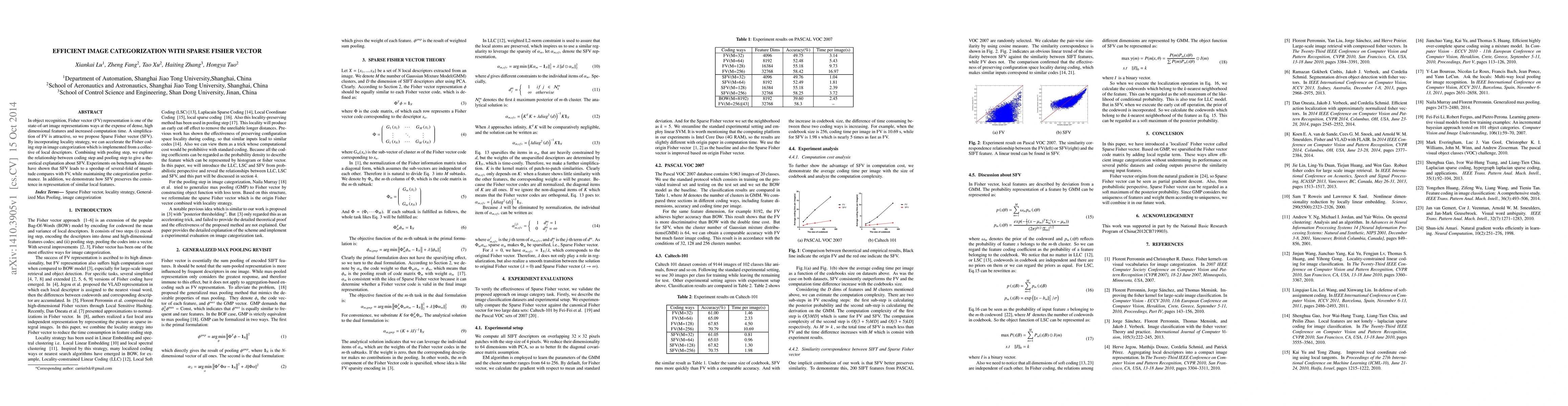 This paper proposes a Sparse Fisher Vector (SFV) method to efficiently categorize images by simplifying the traditional Fisher Vector representation. SFV accelerates the Fisher coding step through a locality strategy, resulting in significant speedups while maintaining categorization performance.