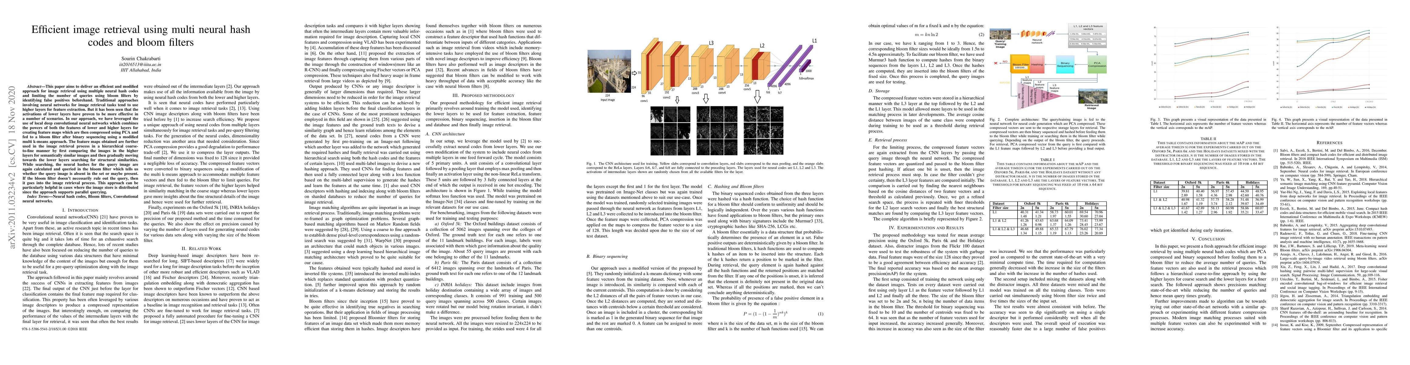 This paper proposes an efficient image retrieval method using multi neural hash codes and bloom filters to reduce query load by preemptively identifying false positives. It leverages local deep convolutional neural networks to extract features from both lower and higher layers, compressing them via PCA and feeding them into a bloom filter for fast querying.
