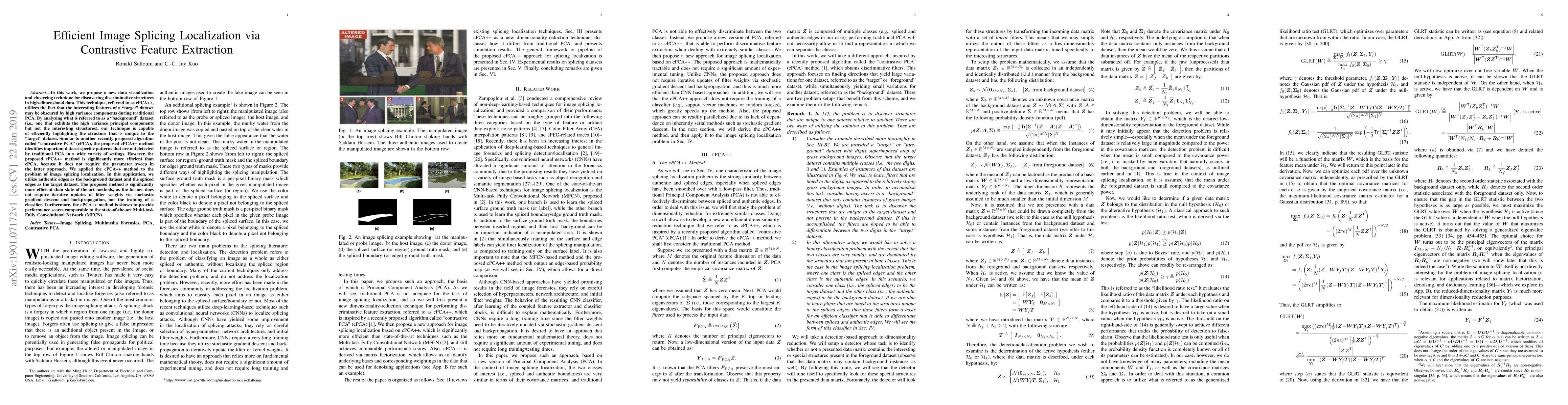 This research introduces cPCA++, a new, efficient data visualization and clustering technique for identifying unique structures in high-dimensional datasets. It outperforms existing methods in image splicing localization, providing comparable results to state-of-the-art Multi-task Fully Convolutional Networks (MFCN), without the need for iterative updates or classifier training.